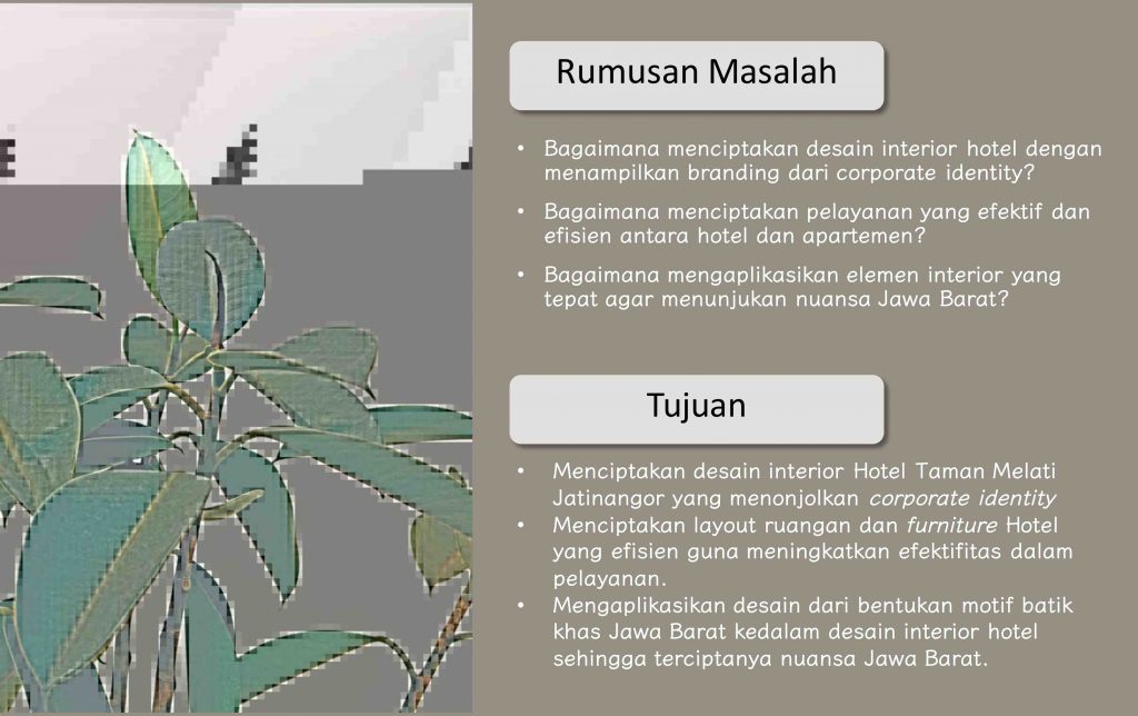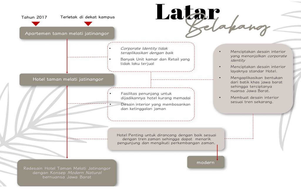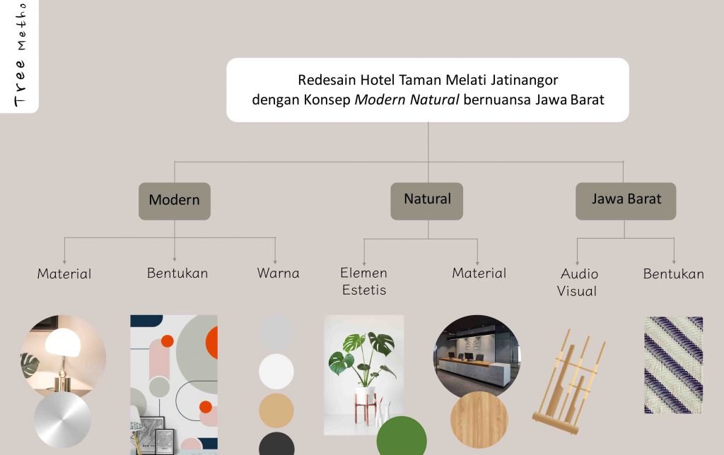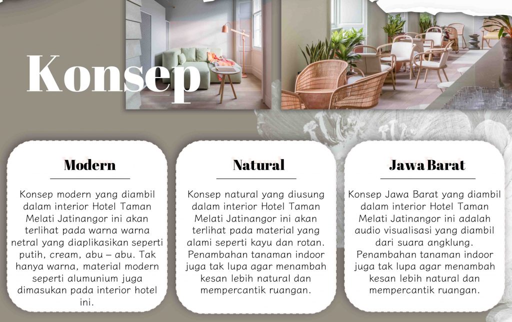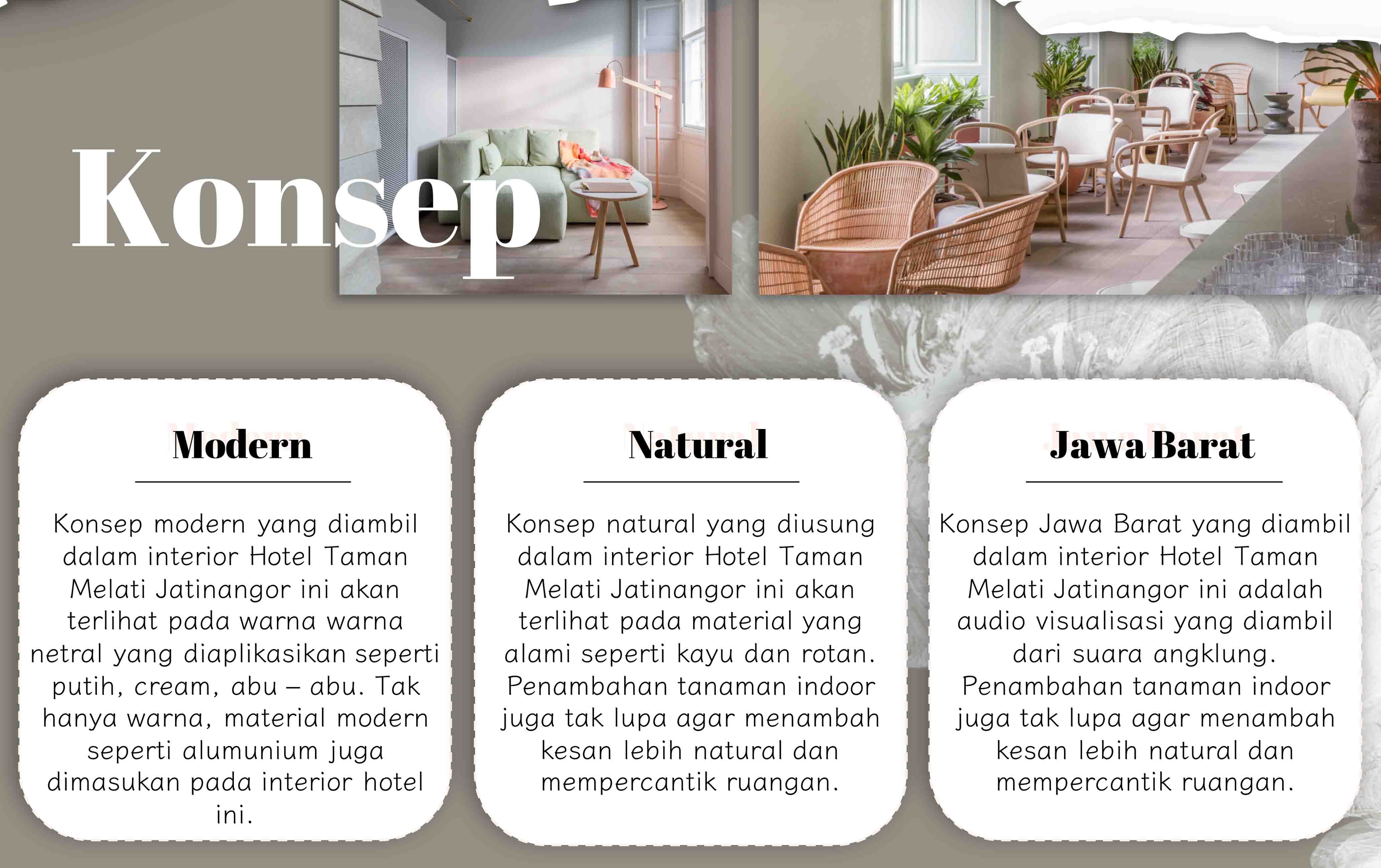 Konsep yang akan diterapkan pada interior Hotel Taman Melati Jatinangor adalah modern, natural dengan nuansa Jawa Barat. Konsep ini kemudian dikembangkan dengan menerapkan kesan modern dalam interior hotel dan tambahan hiasan pepohonan agar terciptanya natural dengan memberikan sebuah aksen berupa nuansa Jawa Barat kecil yang didapatkan melalui penggunaan furniture dan elemen estetis lainnya. Selain itu, budaya Jawa Barat yang akan diangkat adalah Ukiran dan batik khas dari Jawa Barat pada interior hotel, hal ini dikarenakan kurang populernya Ukiran dan batik tersebut di kalangan masyarakat khususnya generasi muda sehingga diperlukan pengemasan yang lebih menarik untuk mempopulerkannya kembali.