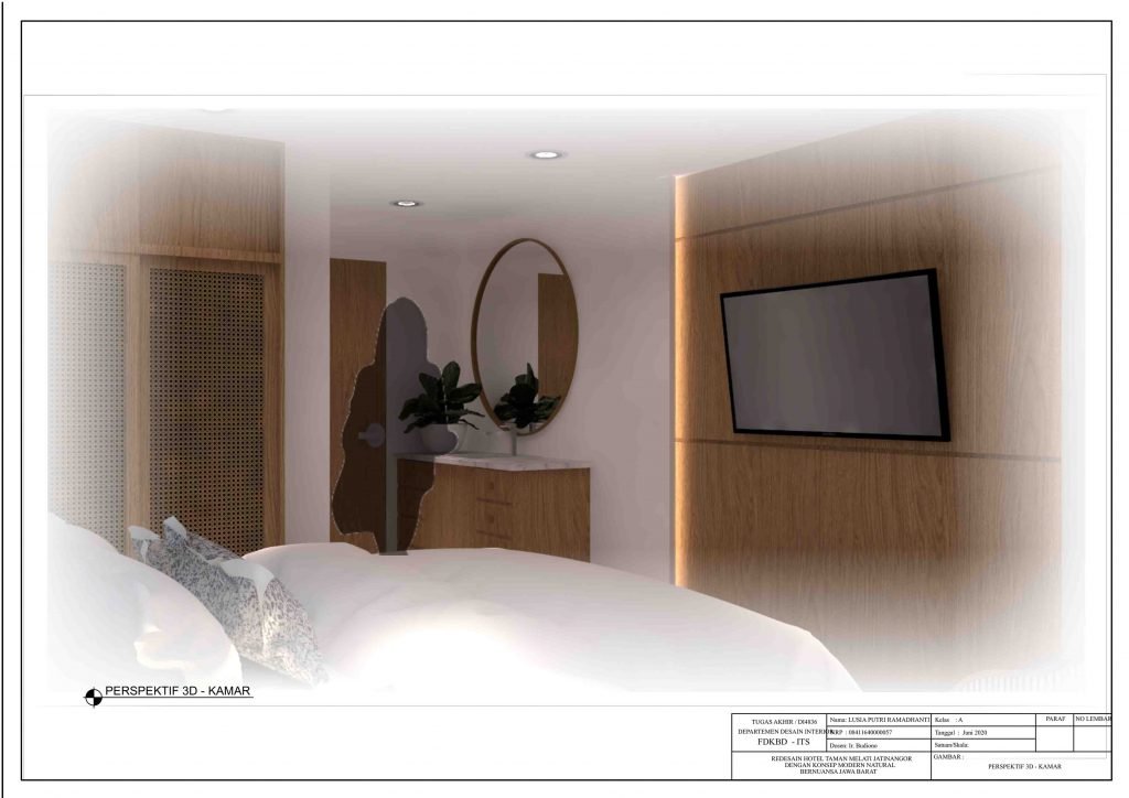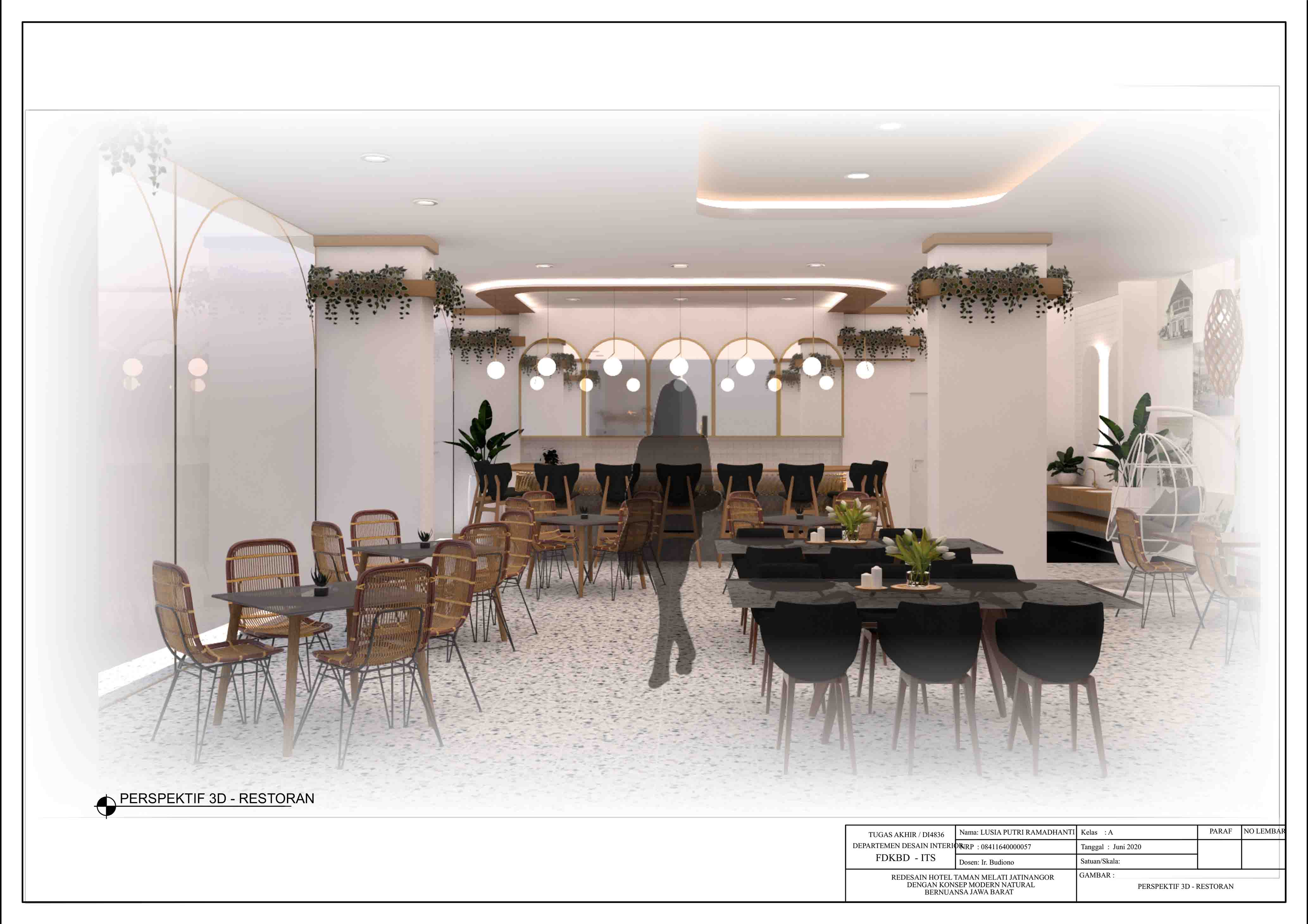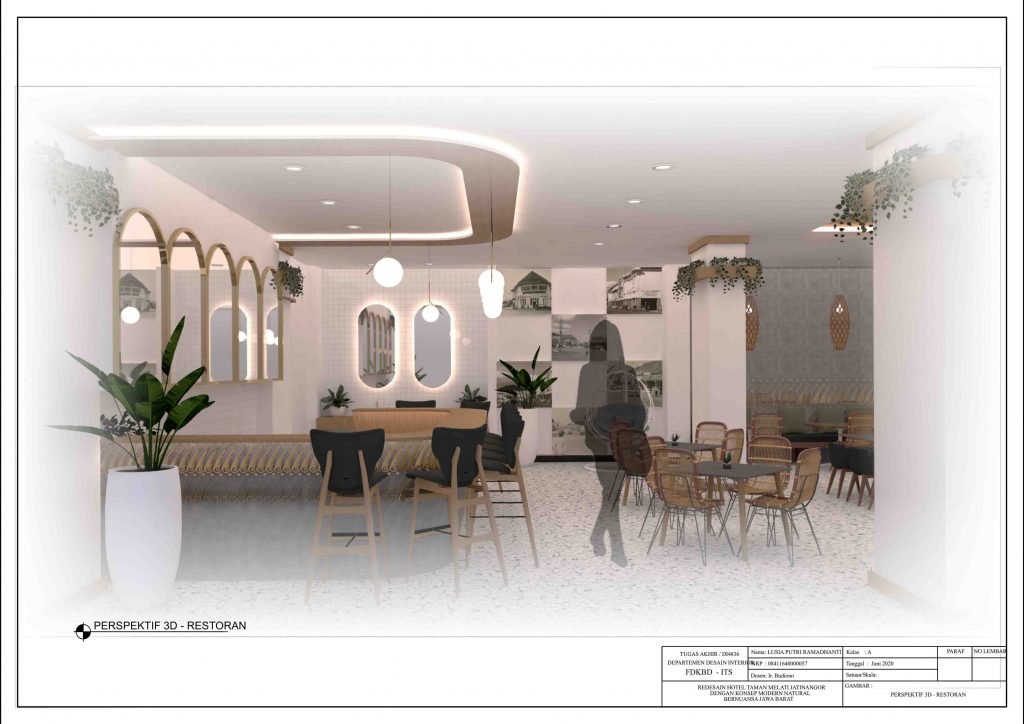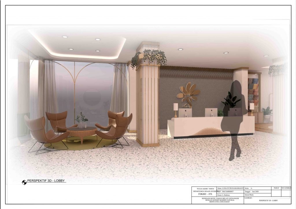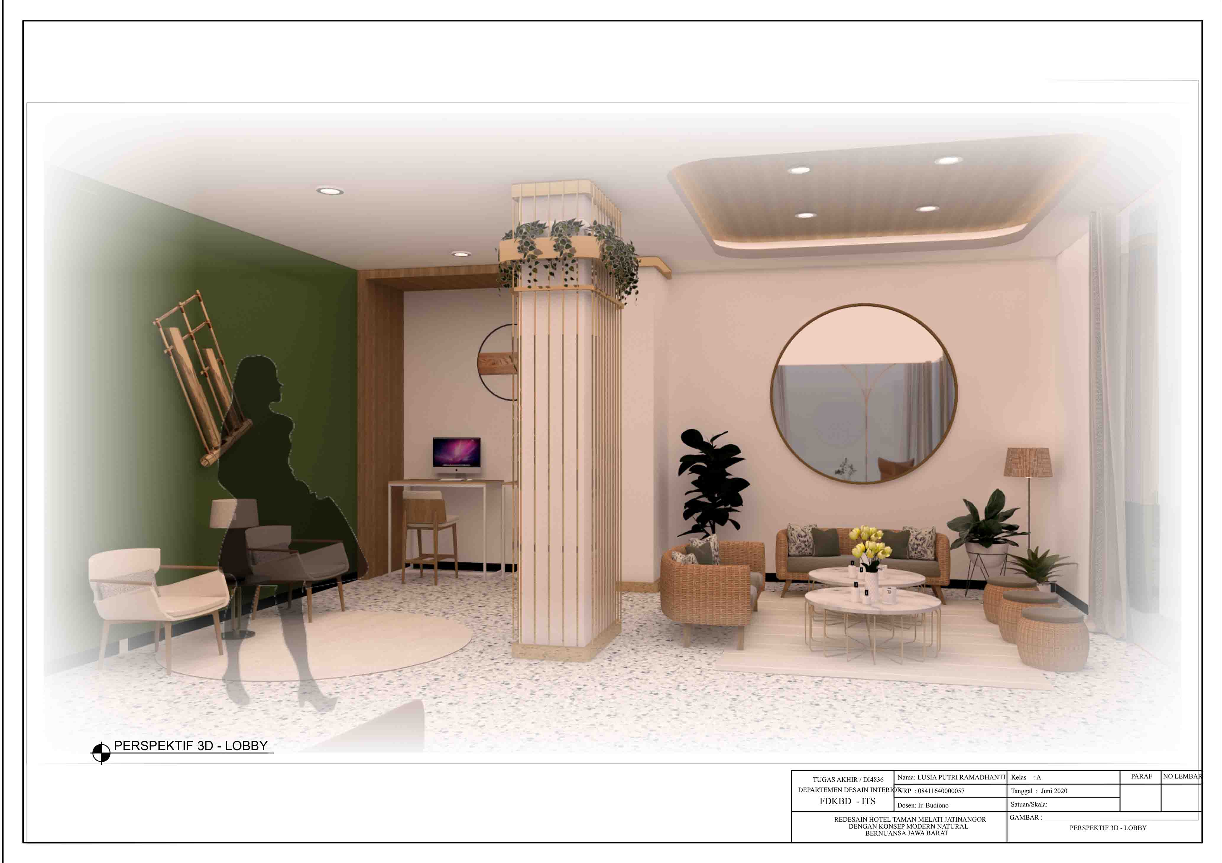 Konsep yang akan diterapkan pada interior Hotel Taman Melati Jatinangor adalah modern, natural dengan nuansa Jawa Barat. Konsep ini kemudian dikembangkan dengan menerapkan kesan modern dalam interior hotel dan tambahan hiasan pepohonan agar terciptanya natural dengan memberikan sebuah aksen berupa nuansa Jawa Barat kecil yang didapatkan melalui penggunaan furniture dan elemen estetis lainnya. Selain itu, budaya Jawa Barat yang akan diangkat adalah Ukiran dan batik khas dari Jawa Barat pada interior hotel, hal ini dikarenakan kurang populernya Ukiran dan batik tersebut di kalangan masyarakat khususnya generasi muda sehingga diperlukan pengemasan yang lebih menarik untuk mempopulerkannya kembali.