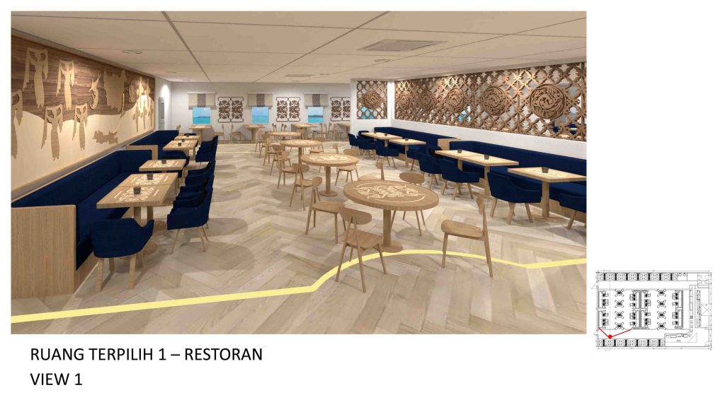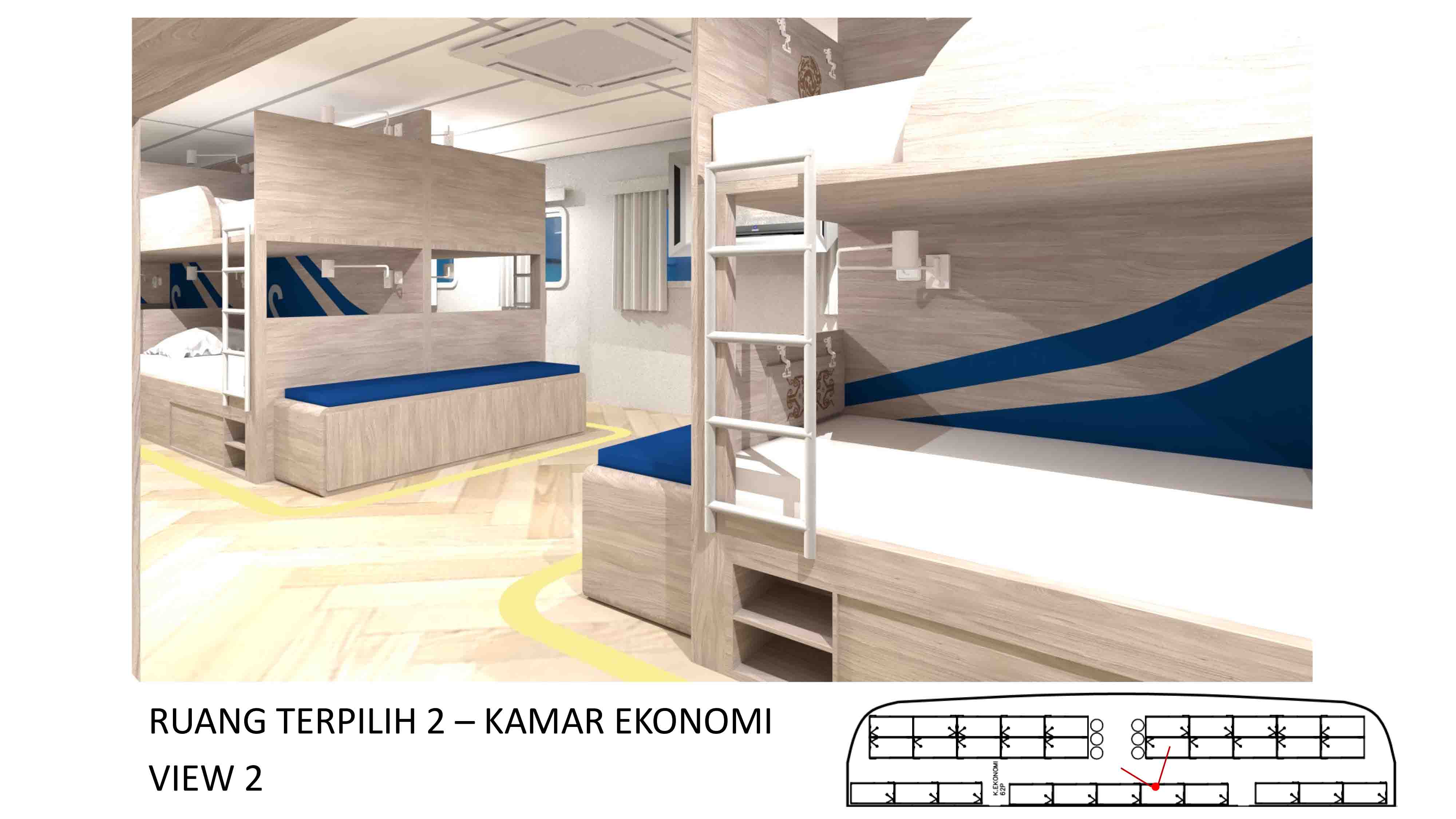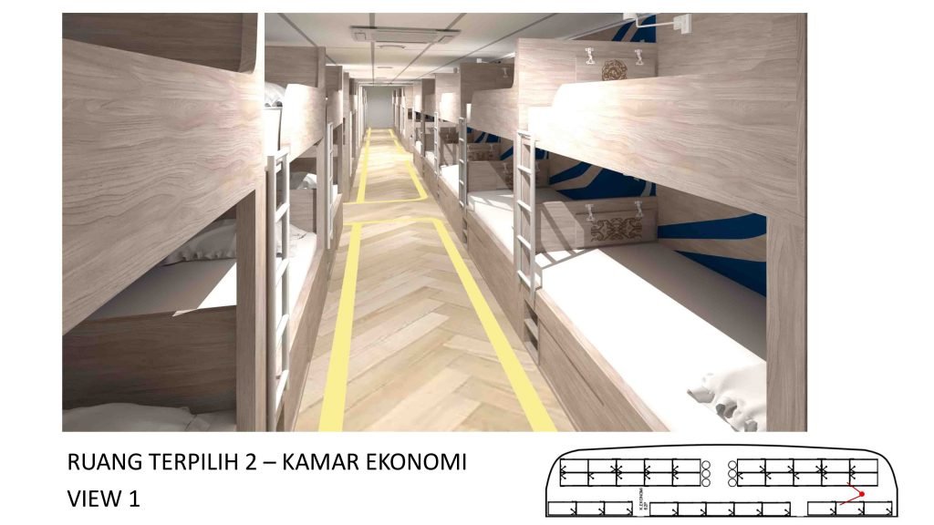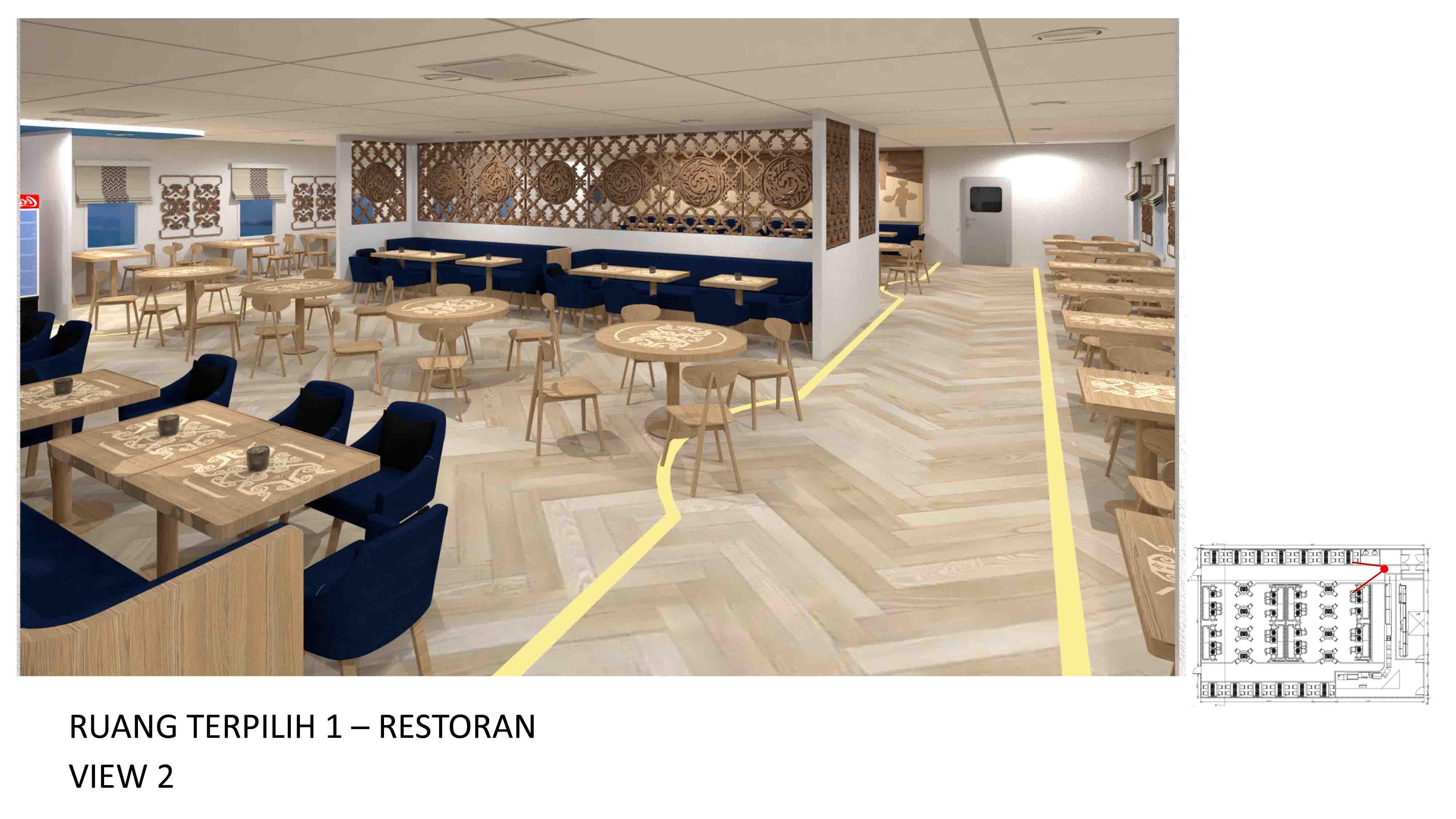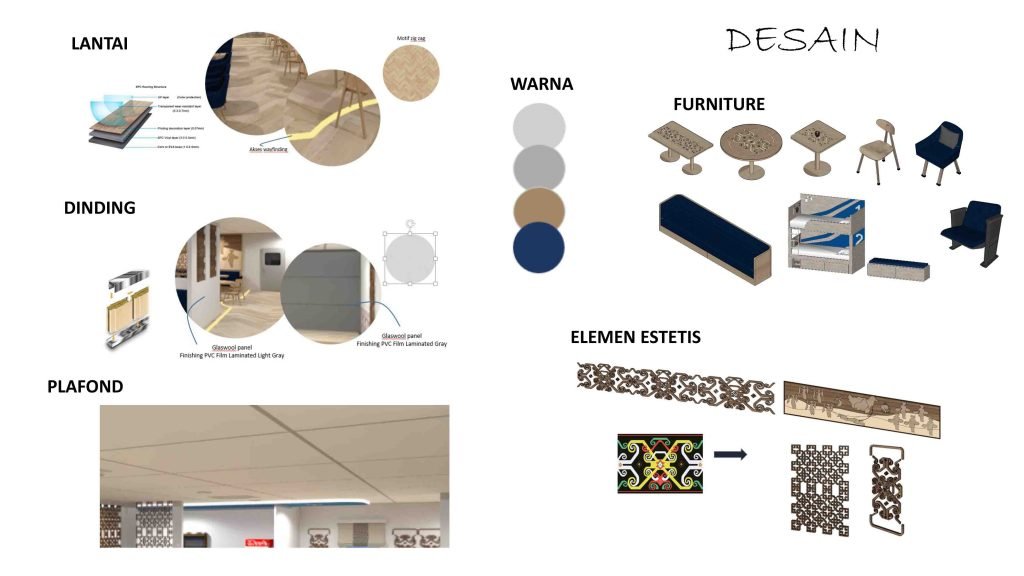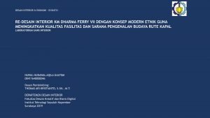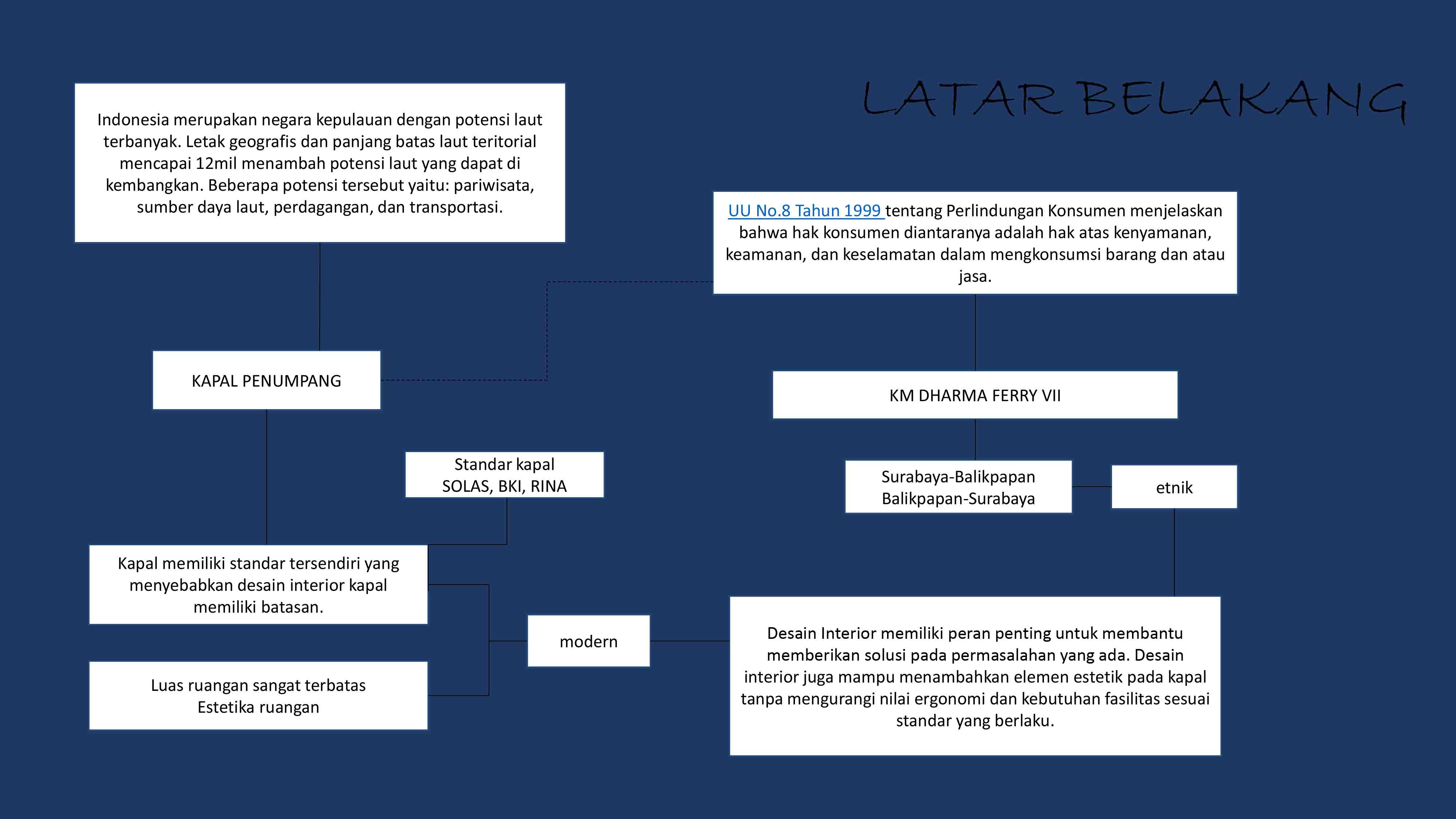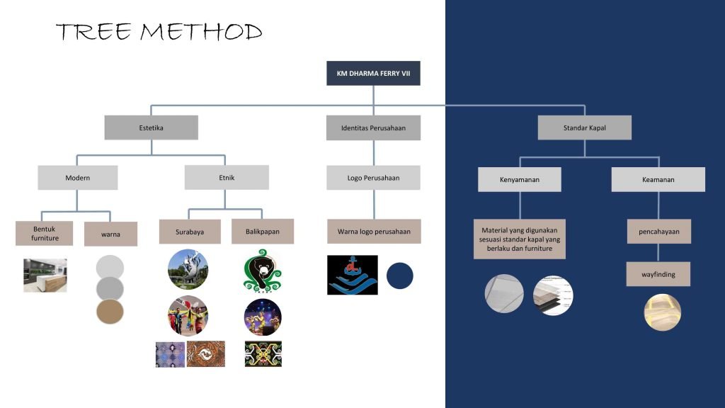 Berdasarkan hasil survei dan wawancara langsung dengan crew kapal, terdapat beberapa kekurangan yang ada pada kapal yaitu kebutuhan fasilitas pada ruang ekonomi, kesatuan interior kapal, dan kejenuhan pada awak kapal. Kejenuhan pada kapal disebabkan karena selama tiga minggu semua awak kapal harus tetap di kapal. Re-desain interior KM Dharma Ferry menerapkan konsep modern etnik. Hal ini selaras dengan aturan aturan pada kapal dan sebagai ciri khas interior kapal untuk meningkatkan kesan pada penumpang. Modern diterapkan pada warna dan bentukan furnitur yang multifungsi, sedangkan etnik sebagai ciri khas interior yang menampilkan rute kapal.