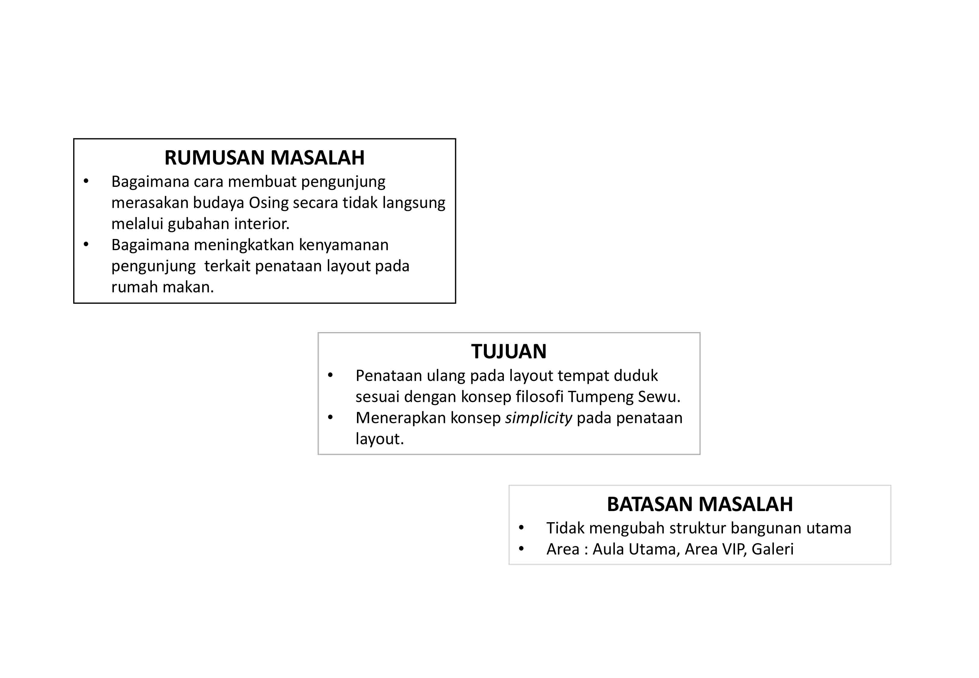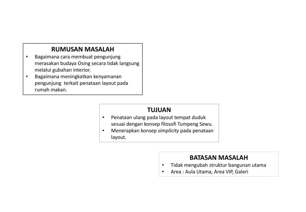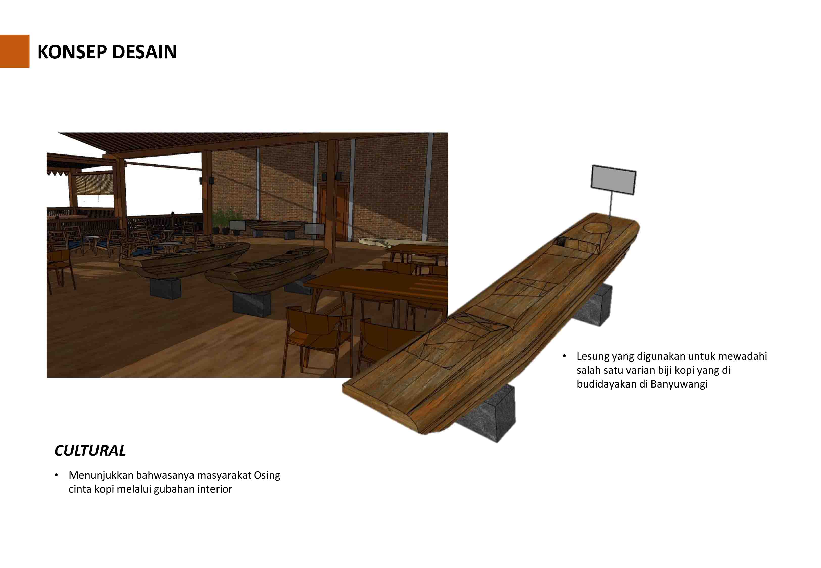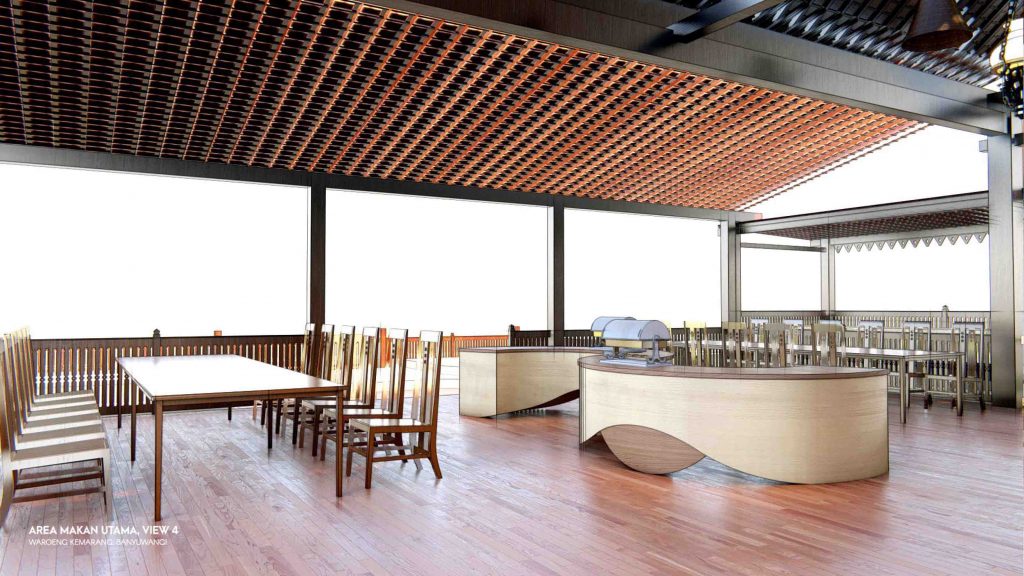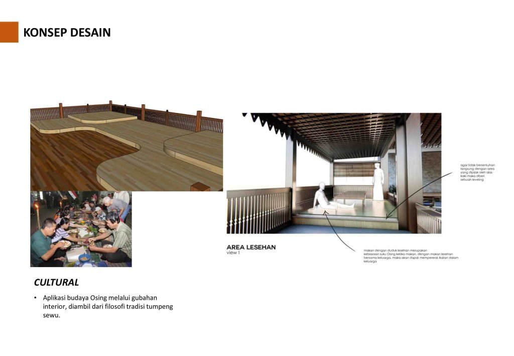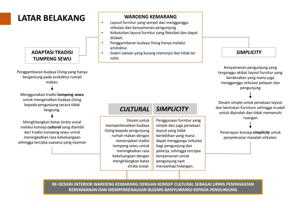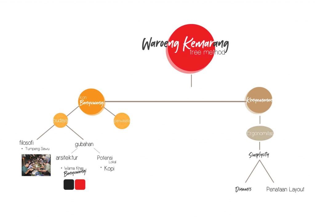 Waroeng Kemarang merupakan sebuah fasilitas umum berupa rumah makan untuk wisatawan lokal dan interlokal. Untuk menarik minat sekaligus memberikan pengalaman maksimal kepada pengunjung rumah makan, maka konsep yang digunakan mengangkat budaya masyarakat Osing. Dengan menerapkan budaya pada furnitur dan desain pada rumah makan maka pengunjung dapat menikmati budaya secara langsung maupun tidak langsung. Untuk itu filosofi tradisi tumpeng sewu digunakan untuk memaksimalkan kenyamanan, dan menggambarkan kesederhanaan kehidupan masyarakat Osing dengan menggunakan konsep simplicity pada furnitur rumah makan.