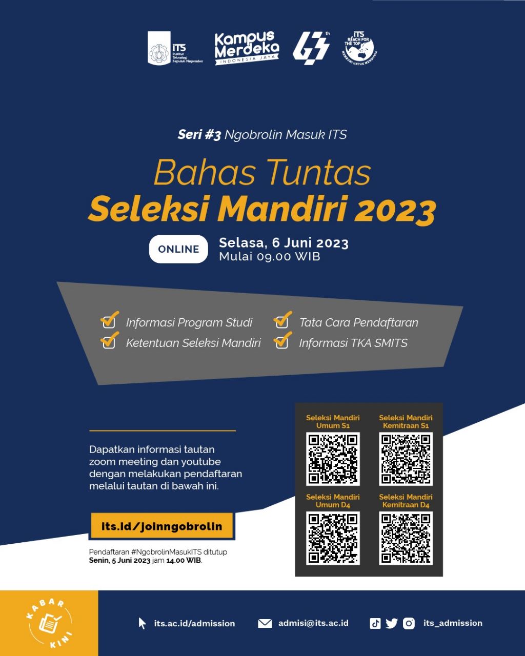 Pendaftaran Seleksi Mandiri ITS segera akan dibuka. Mau tahu lebih detail tentang ketentuan seleksi Mandiri ITS? Ikuti Bahas Tuntas Seleksi Mandiri 2023 yang akan dilaksanaan pada: