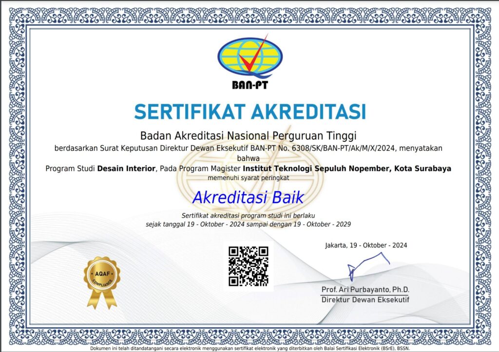 Program Sarjana Departemen Desain Interior telah mendapatkan perpanjangan akreditasi A oleh BAN-PT Indonesia yang berlaku mulai 23 September 2025 – 23 September 2030