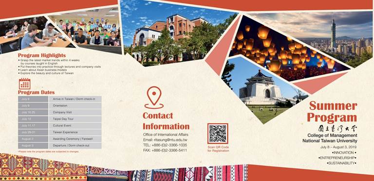 They are pleased to introduce you to the “2019 Innovation, Entrepreneurship & Sustainability Summer Program.” The College of Management at NTU strives to continually offer enriching programs to benefit future and current students worldwide. This program will be held on July 8, 2019 – August 3, 2019 at National Taiwan University, Taipei City, Taiwan and open for undergraduate(D3, D4, S1) & Graduate students (S2, S3)