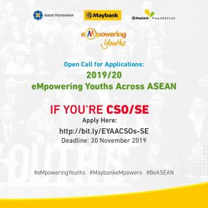 eMpowering Youths Across ASEAN (EYAA) Programme is back and we are inviting you to grab the opportunity and join our second cohort (2019-2020) of change-makers in making positive, lasting impact in communities in the region by immersing yourselves in social volunteering and community investment projects throughout the selected ASEAN Region. Seize the chance of a lifetime to meet other inspiring youths in the Annual EYAA Regional Workshop by exclusively invited panels of experts from all over the world where you will learn to ideate and plan your project while working together with local civil society organisations (CSOs) and social enterprises (SEs) of your choice in Bangkok, Thailand!