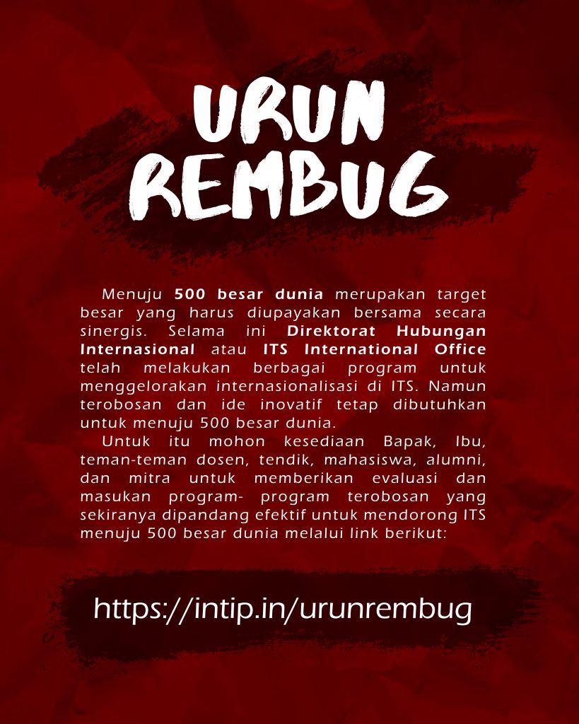 Menuju 500 besar dunia merupakan target besar yang harus diupayakan bersama secara sinergis. Selama ini Direktorat Hubungan Internasional atau ITS International Office telah melakukan berbagai program untuk menggelorakan internasionalisasi di ITS. Namun terobosan & ide inovatif dibutuhkan untuk menuju 500 besar dunia. Untuk itu mohon kesediaan Bapak, Ibu, teman-teman dosen, tendik, mahasiswa, alumni, dan mitra untuk memberikan evaluasi dan masukan program-program terobosan yang sekiranya dipandang efektif untuk mendorong ITS menuju 500 besar dunia melalui link berikut: