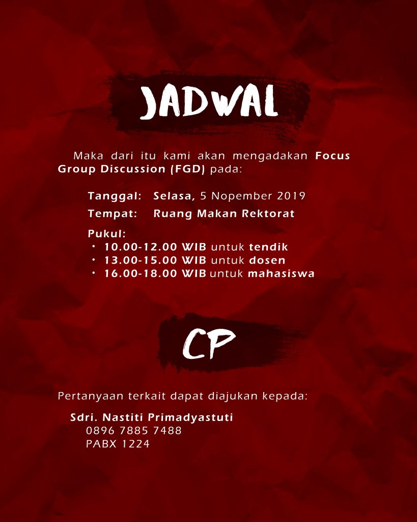 Tanggal: Selasa, 5 Nopember 2019 Tempat: Ruang Makan Rektorat Kegiatan: Focus Group Discussion (FGD) Jadwal: 10-12 untuk tendik 13-15 untuk dosen 16-18 untuk mahasiswa