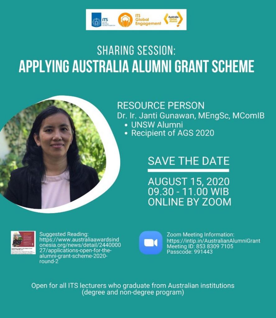Bersama ini kami bermaksud menyampaikan informasi Sharing Session “Applying Australia Alumni Grant Scheme” yang akan diselenggarakan pada hari Sabtu, 15 Agustus 2020, pukul 09.30 – 11.00