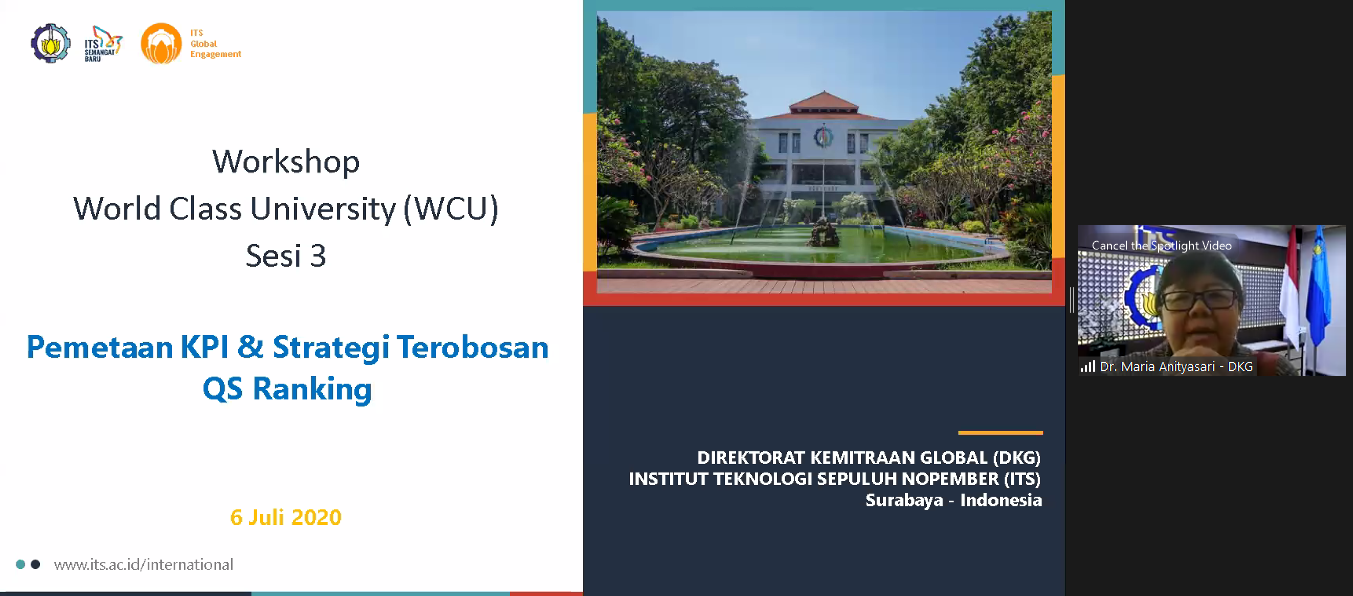 After going through the World Class University (WCU) Workshop session 1 on June 25, 2020 and session 2 on June 29, 2020, the WCU Workshop has reached its third session. The WCU workshop which took place on July 6, 2020 with the topic ‘KPI Mapping and QS Ranking Breakthrough Strategies’. In a meeting held virtually via zoom meeting, Assoc. Prof. Maria Anityasari, Ph. D. as Director of ITS Global Engagement, specifically mapped the Key Performance Indicator (KPI) and presented strategies to improve ITS rankings in the QS Ranking. Before starting the presentation, he first tested the workshop participants’ understanding of the topics that had been delivered in the previous session of the WCU Workshop through the Kahoot Quiz.