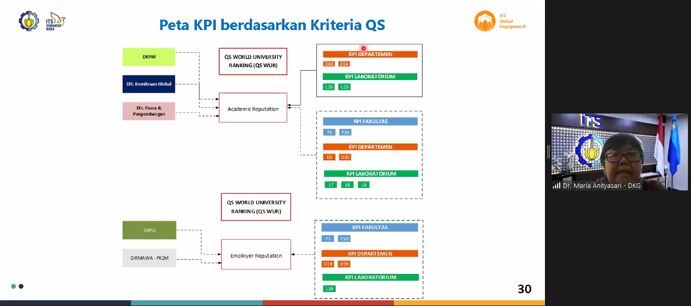 Maria Anityasari continued the presentation by showing the KPI mapping of faculties, departments, and laboratories based on the QS WUR ranking criteria. According to her, there are still some deficiencies in KPI from faculties, departments, and laboratories. For example, there are already KPIs that are directly related to the QS WUR criteria, but they are less strong and less balanced. To end the presentation, Maria Anityasari presented several breakthrough strategies. One of the strategies he conveyed was to hold a WCU Workshop to increase the understanding of the ITS academic community regarding the world university ranking. Moreover, there is a Global Learning Program (GLP) and Guest Lecture Series (GLS) which can pave the way for ITS to collaborate with universities abroad.