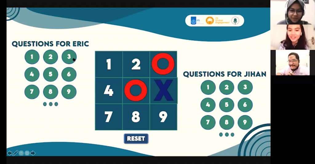 Budcast is back again with a new episode that will broaden one’s knowledge with its fresh concept and interesting topic of discussion. In this fifth episode of Budcast, Eric, a KNB student from Panama, and his buddy, Jihan, an ITS Global Engagement volunteer, played a very interesting game of TIC TAC TOE with a little twist. Unlike the ordinary game, the players will have to answer questions on the opposite player’s culture before marking their moves on the TIC TAC TOE board, so Eric needs to answer questions about Indonesia’s culture and Jihan needs to answer questions on Panama’s culture. Through this fun game, Budcast highlighted the importance of preserving a nation’s cultural diversity to achieve SDG 11, Sustainable Cities and Communities.