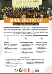 Shibaura Institute of Technology (SIT) Japan are proudly presents “Global Project Based Learning (gPBL) Virtual 2020 at SIT Japan”. This program will be held on 10 – 18 December 2020 by virtually