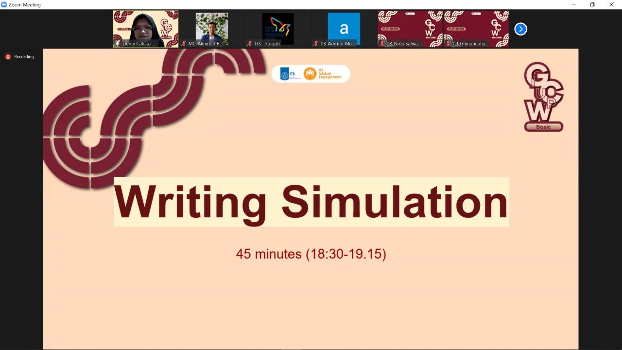 On the first day of the event, GCW IUP: Basic was opened with a “Global Thinking” session that was brought by Assoc. Prof. Maria Anityasari Ph.D., the director of ITS Global Engagement, followed by “Knowing Opportunities” session brought by Faiqoh Agustin S.T, a staff of ITS Global Engagement. Then, with two sessions of simulation, the Writing Simulation (consist of Descriptive Writing & Essay Writing) and Speaking Simulation, the first day of GCW IUP: Basic was ended successfully.