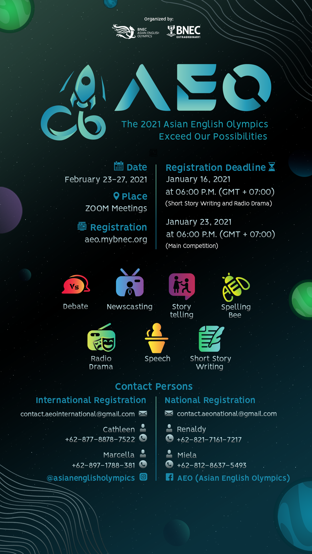 We are delighted to invite all of you to send your talents to The 2021 Asian English Olympics – “Exceed Our Possibilities.” Asian English Olympics (AEO) is one of the biggest and most anticipated annual English competitions in Asia for high school and undergraduate students.