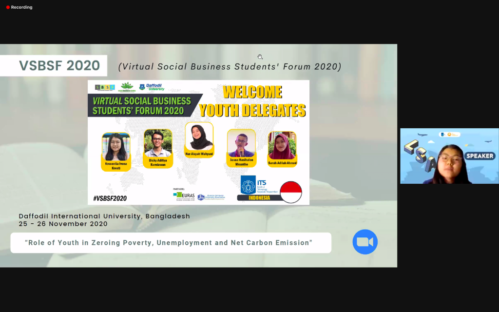 The event continued with the second session which discussed Student Forum Program. This session was delivered by Kresentia Ivena Krisanti, a student of the Architecture department batch of 2019. She was participating in the Virtual Social Business Students Forum (SBSF) 2020 at Daffodil International University (DIU), Bangladesh. In this session, she explained her experience in participating in social business student forums such as learn about other country’s culture and keynote speech sessions presented by Prof. Muhammad Yunus or also known as “Father of Social Business and Microcredit”. After the second session ended, there was a Question and Answer session to talk about the material from the first and second sessions. Several questions were asked by participants.