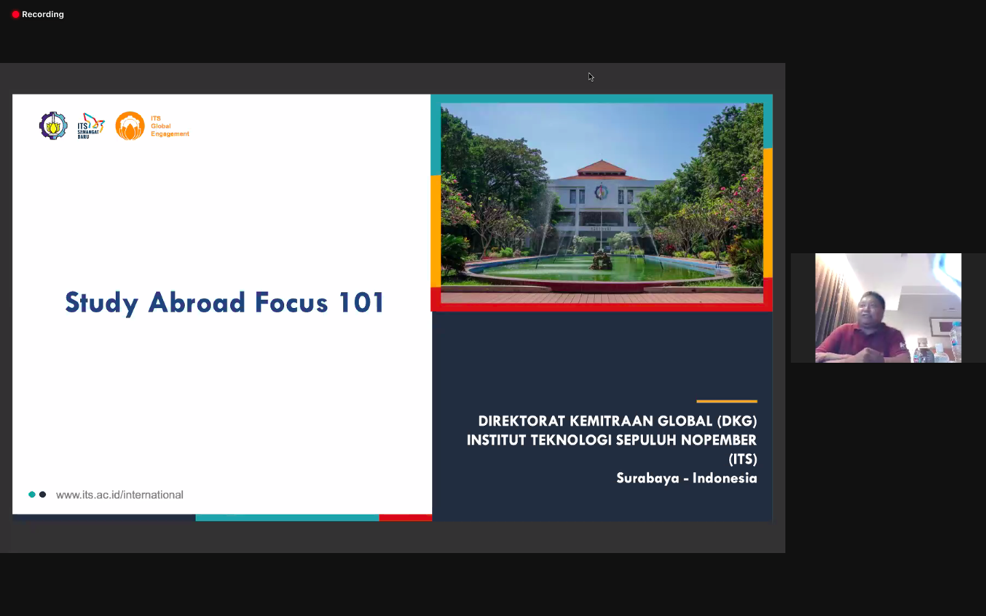 Let’s Study Abroad (LSA) Special Online Programs is a sharing and consultation session from ITS students who have participated in online study abroad programs in both academic or non-academic fields and with ITS GE staff. Due to the pandemic COVID-19, almost all study abroad programs are conducted virtually. Therefore, Let’s Study Abroad (LSA) specifically discussed the online programs. This session was held on 23 January 2021 from 09.00 WIB until 12.00 WIB. The event was started with Kahoot games which discussed how much the participants know about study abroad programs. All participants joined the game with great enthusiasm. The event continued with an explanation about study abroad by Mr. Muh. Wahyu Islami PM, S.T. (CommTECH & Mobility Program Manager ITS Global Engagement).