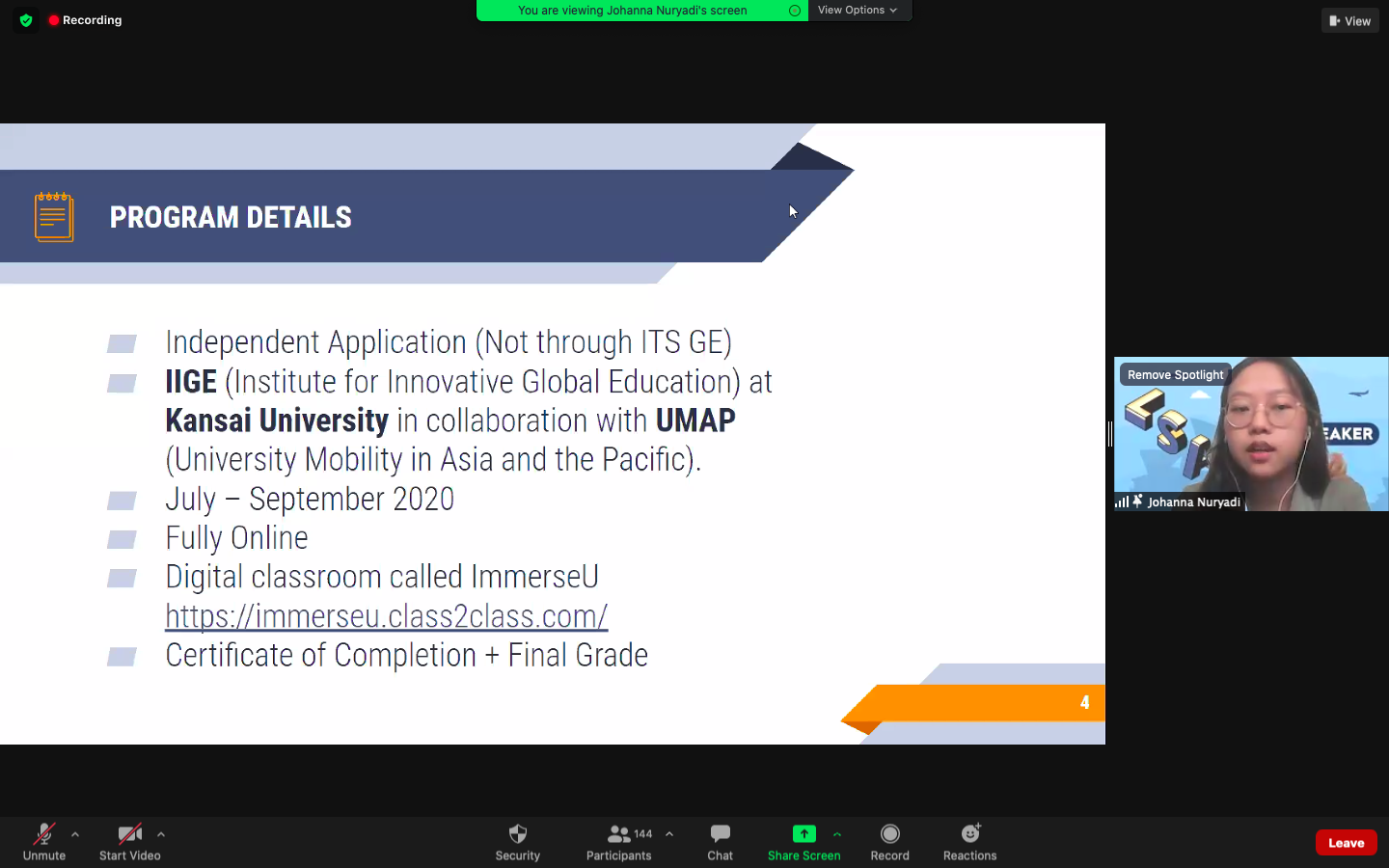 The first session started with an explanation about the online short program which is delivered by Johanna Nuryadi, a student of the Mathematics department batch of 2018. She was a participant in UMAP COIL Joint Program 2020: SDGs 2030 at Kansai University, Japan. She explained her experience while joining the program and tips & tricks about how to apply for an online short program without going through ITS GE.