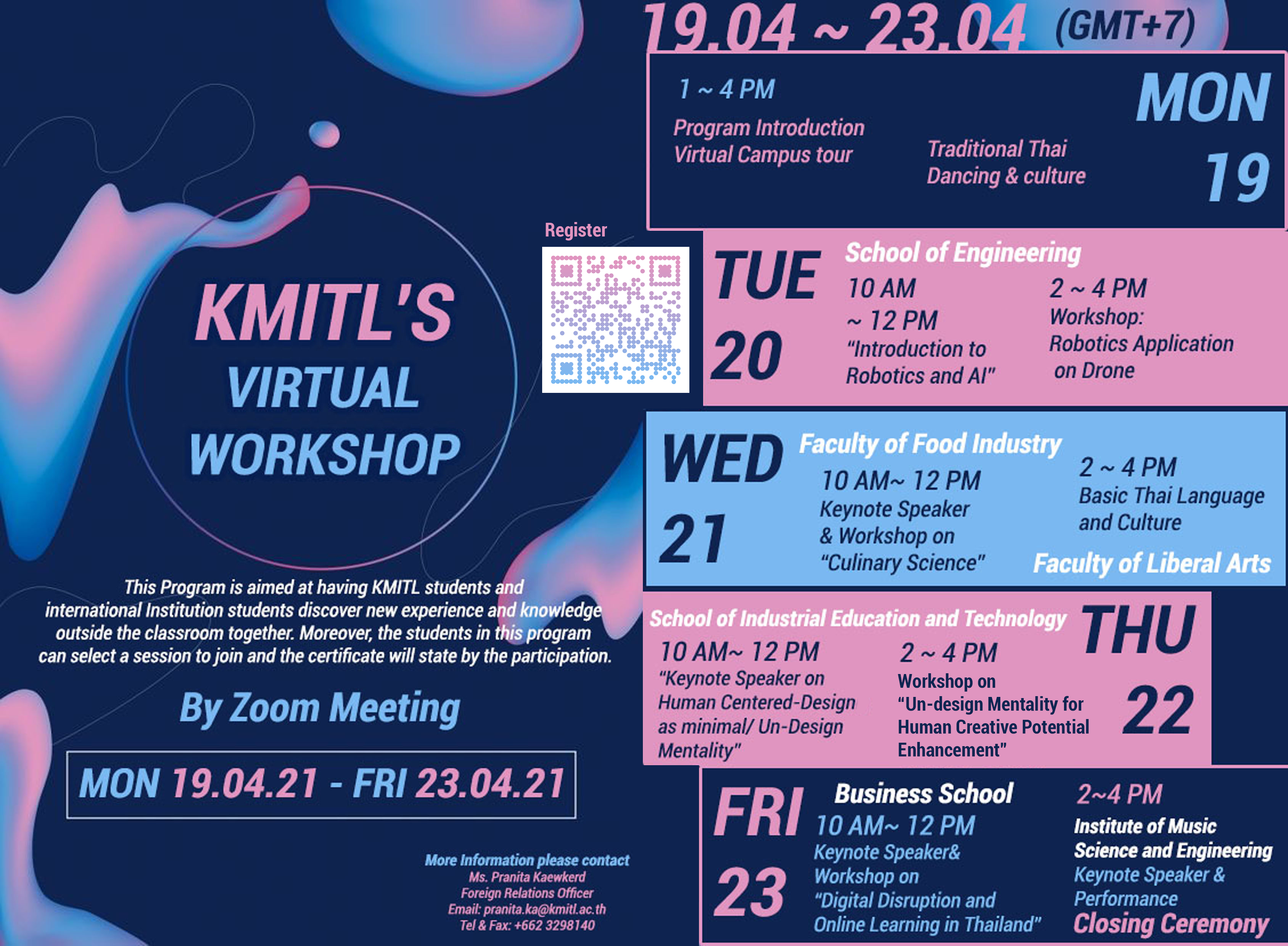 We are happy to inform you to KMITL Virtual Workshop 2021. We would like to invite international students to join the “KMITL Virtual Workshop 2021”, a 5–day activity with a special topic speaker and workshop from KMITL. This program is aimed at having KMITL students and international Institution students discover new experiences and knowledge outside the classroom together. Moreover, the students in this program can select a session to join, and receive a certificate from participating. However, it would be great if all the students can participate in the first session on April 19, 2021.