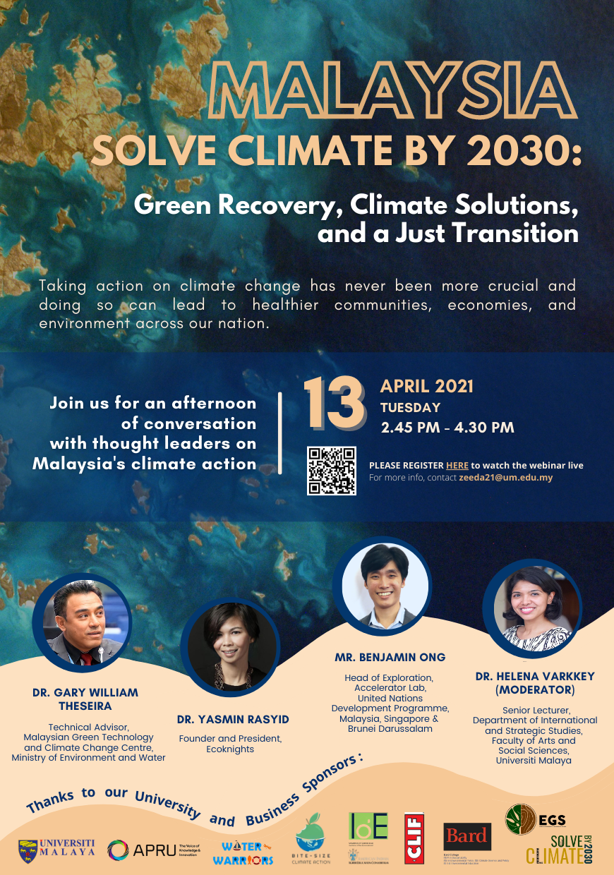 We are pleased to inform you that The University of Malaya (UM) is organising a webinar on “Malaysia Solve Climate 2030: Green Recovery, Climate Solutions, and a Just Transition” – the first event of “Celebrating UM International Engagement 2021”. This program is a continuation of UM’s International Week (iWeek) 2020 as well as UM International Webinar Series 2020. This webinar is also under the “Solve Climate by 2030” International Initiative led by Bard College in collaboration with Open Society University Network and the Association of Pacific Rim Universities (APRU).