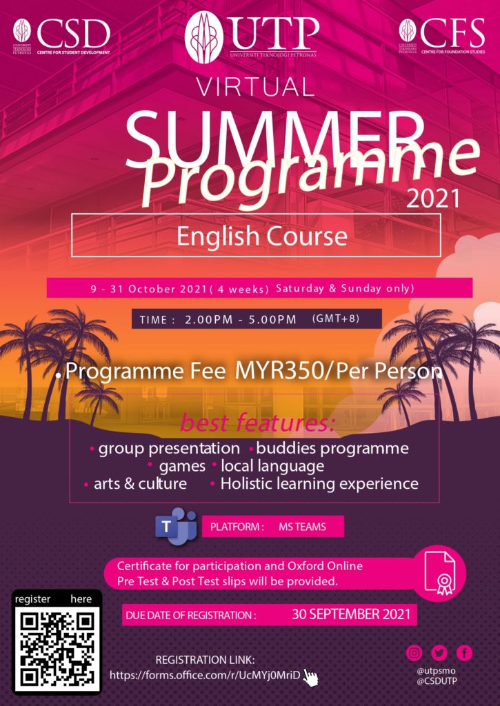 Greetings ITS Students! UTP is pleased to announce that UTP Virtual Summer Programme 2021 is back this yeard. But unfortunately, this event is postponed to 9 until 31 October 2021. Therefore, UTP as the committee of the event is extending the registration due date to 30 September 2021.