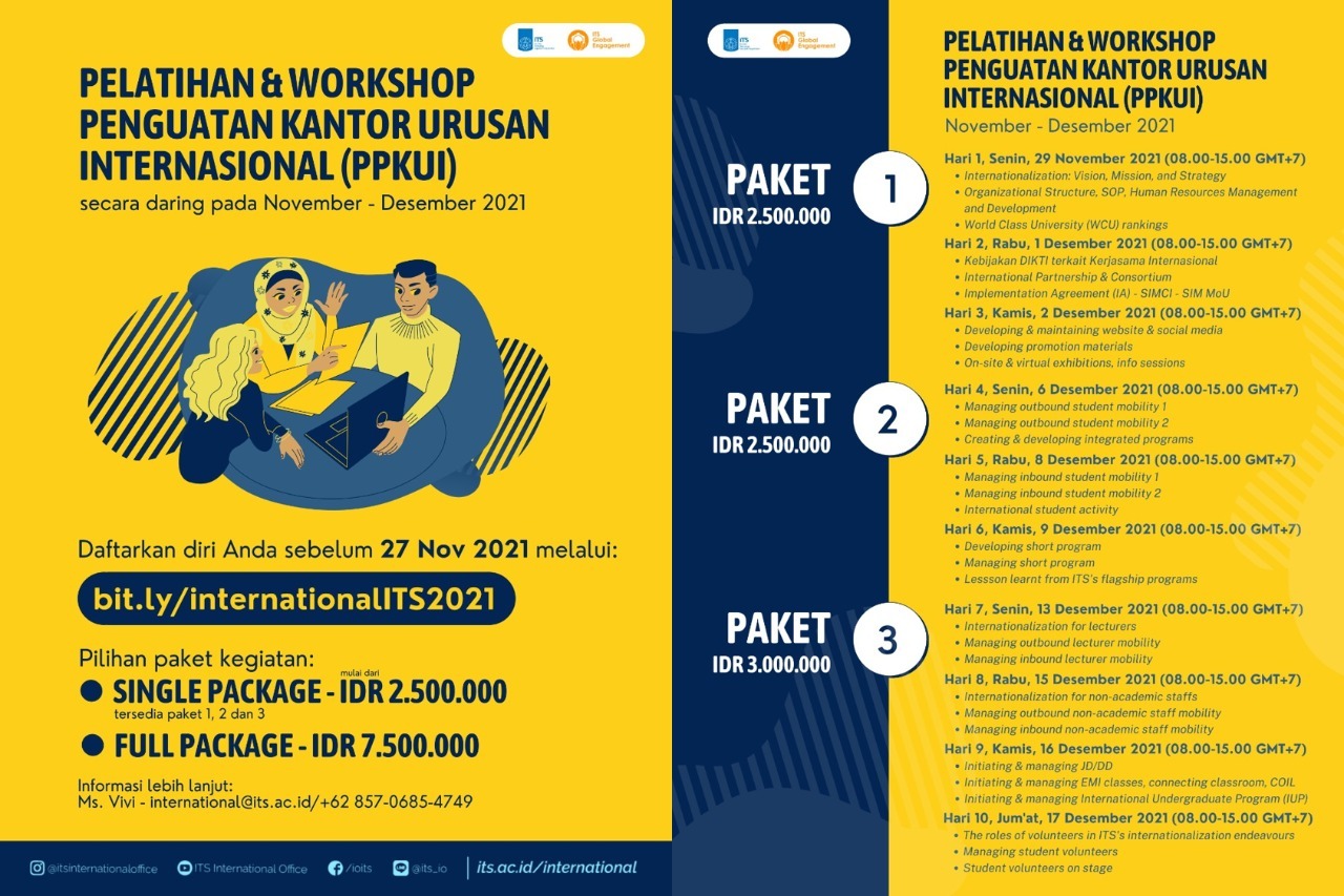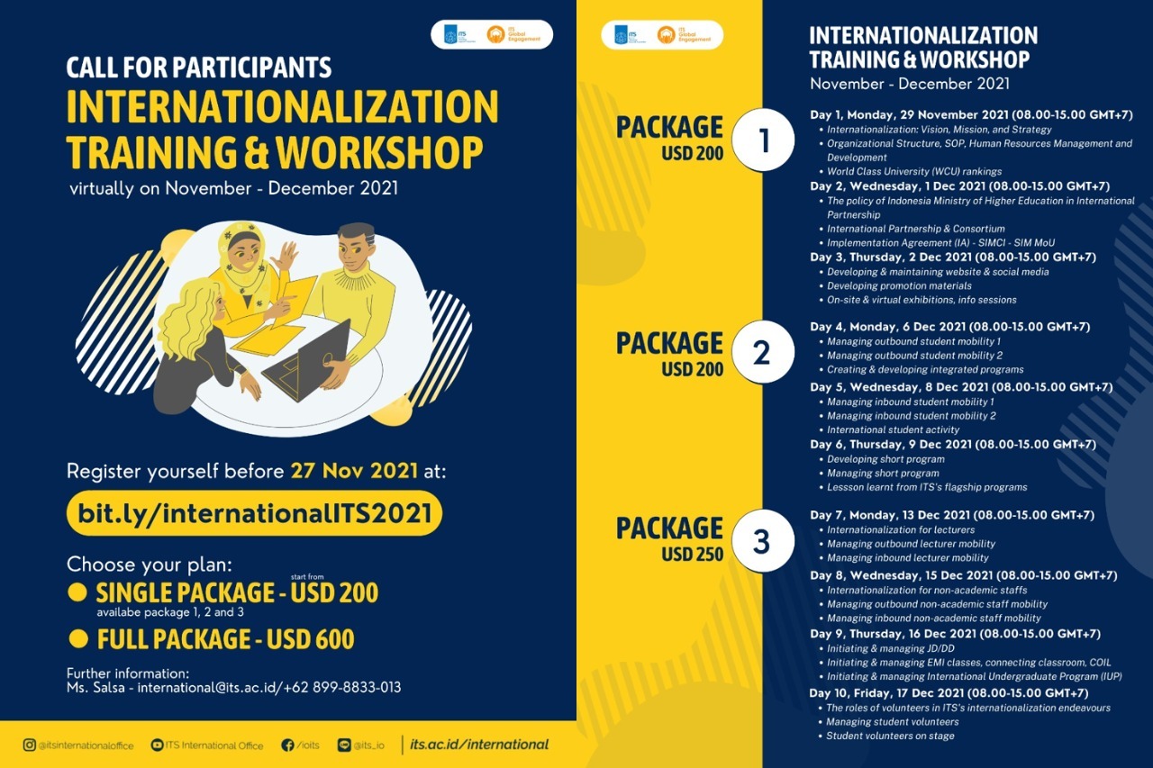 Institut Teknologi Sepuluh Nopember (ITS) is calling for participant for Internationalization Training & Workshop for HEs international officers which will be conducted online in November-Desember 2021, consisting of 10 days (3 packages) activities.