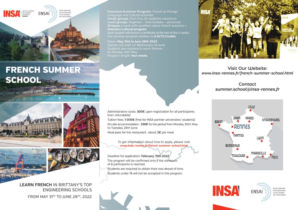 The next INSA-ENSAI Summer School will take place from May 31st to June 28th 2022.