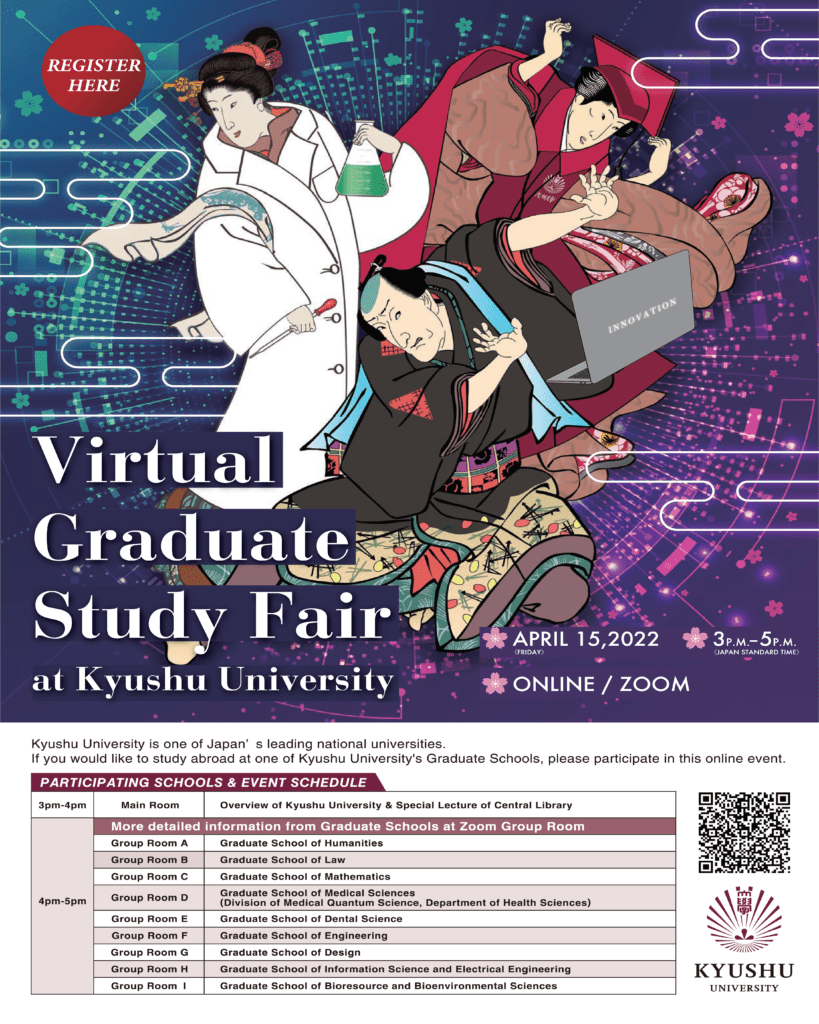 Kyushu University, Japan, is inviting you to join Kyushu University Virtual Study Abroad Fair in 2022. At this event, there will be a brief introduction to Kyushu University and an overview of the new Graduate School of Design programs. Participants will be able to freely ask in the live QnA session. This event will be delivered in English.