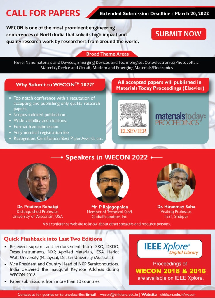 Chitkara University of India invites you to join the 7th World Engineering Conference on Contemporary Technologies WECON 2022. WECON is one of the most prominent engineering conferences of North India that solicits high-impact and quality research work by researchers from around the world.