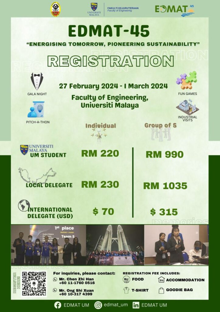 Grab your registration tickets now for EDMAT-45: Energising Tomorrow, Pioneering Sustainability ๐ฑ๐คฉ The registration period is till 31 January 2024 ๐