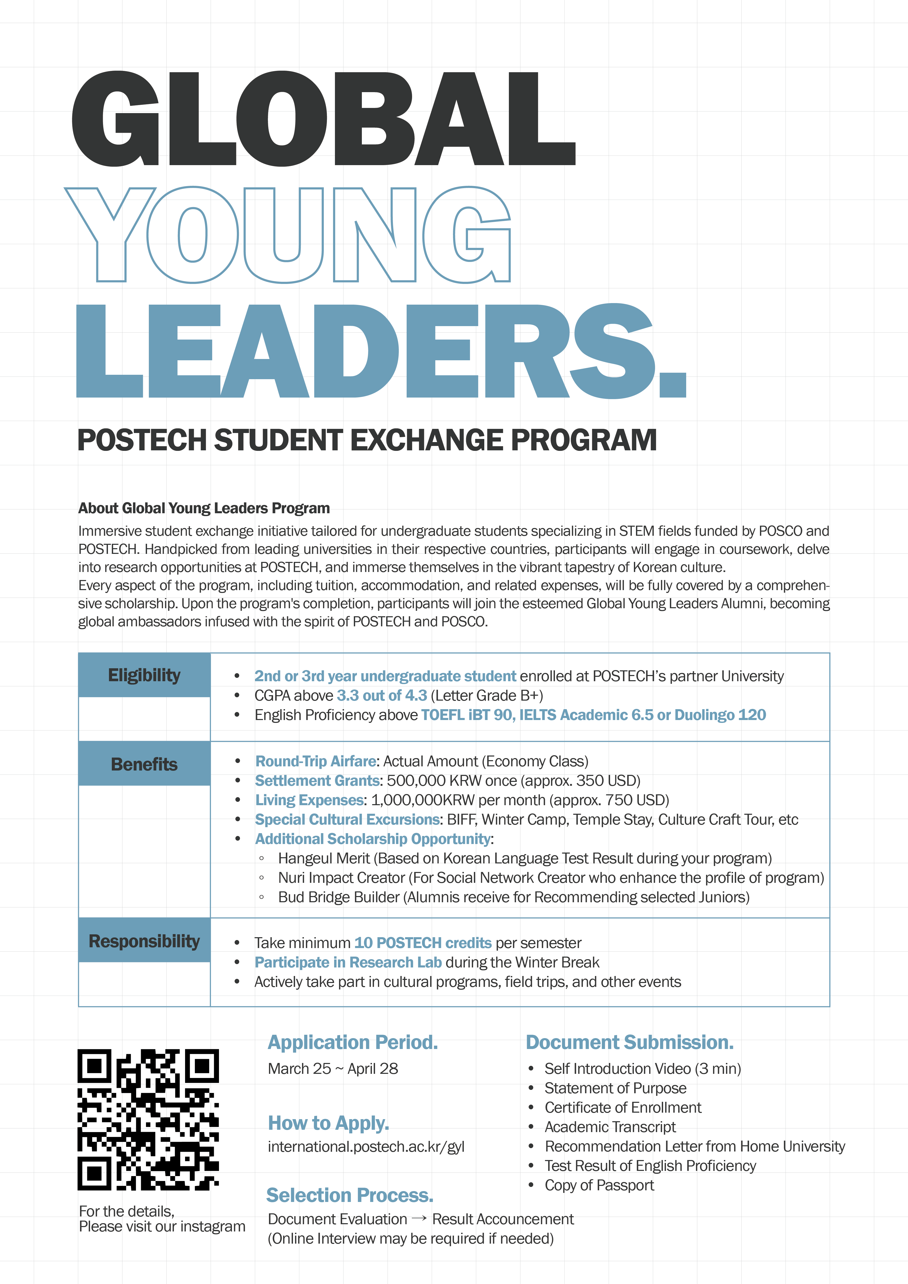 Pohang University of Science & Technology (POSTECH) South Korea would like to inform you that the registration for Global Young Leaders Scholarship application for academic year 2024-2025 is open. The tuition fee for this program is waived.