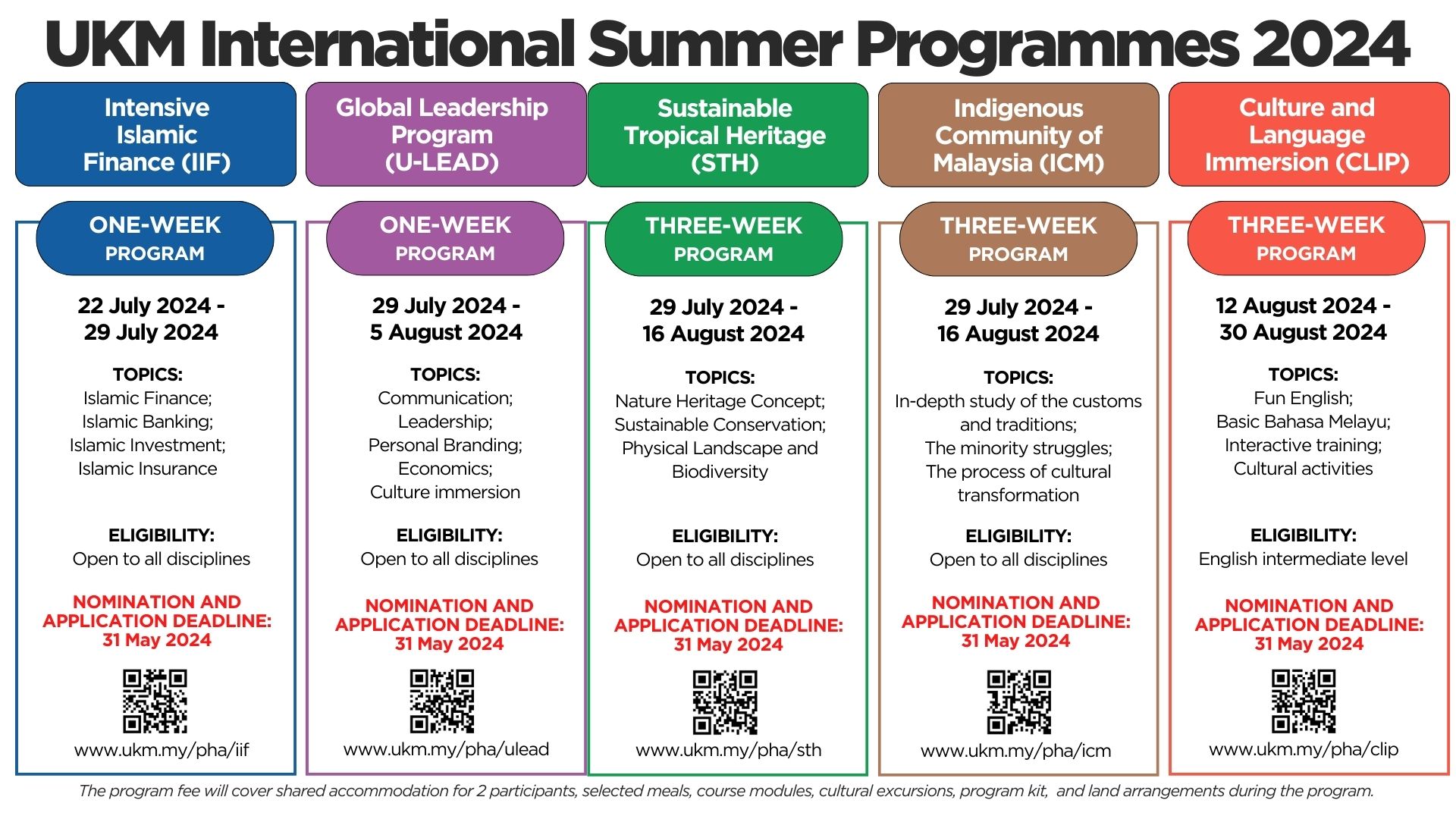UKM International Summer Programme is specially designed by the International Relations Centre (UKM Global), Universiti Kebangsaan Malaysia (UKM) collaborated with partners at the faculties and research institute at UKM. The proposed programs are of short-term classes and cultural emersion of the university from one-week to one-month with a basic certificate or transfer credit.