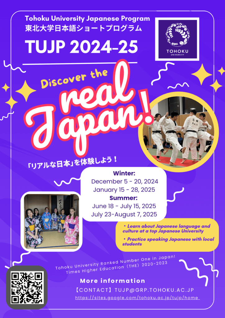 Tohoku University Japanese Program (TUJP) is a short program designed to improve your Japanese proficiency and deepen your understanding of Japan. It includes intensive Japanese lessons with practical activities to reinforce language use, along with interactive sessions on both traditional and contemporary Japanese culture and society. The program also offers collaborative learning opportunities with local Tohoku University students, who will serve as “buddies” to welcome and support you throughout. Tailored to your needs and interests, this program is designed to help you experience the REAL Japan.