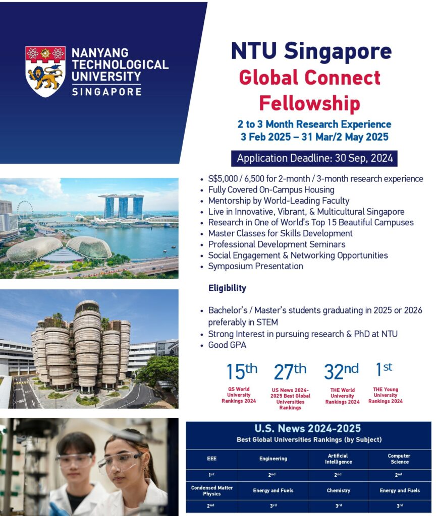 Dear ITS Students, we are happy inform you of an exciting opportunity for your students to spend this spring in Singapore one of the most vibrant, international, state-of-the-art campus through the prestigious research programme. NTU Singapore Global Connect Fellowship (GCF) Spring Intake starting on 3 February 2025. The Fellowship will be for 3 months (College of Science) / 2 months (All other Schools).