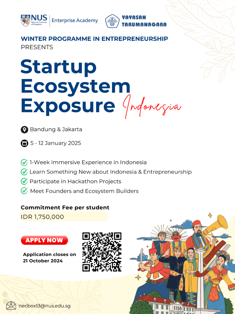 Institut Teknologi Sepuluh Nopember (ITS) is excited to announce a new opportunity for our entrepreneurial students! In collaboration with Tarumanagara Foundation and the National University of Singapore (NUS), the Startup Ecosystem Exposure Indonesia program is your gateway to exploring the vibrant regional startup ecosystem in Indonesia.