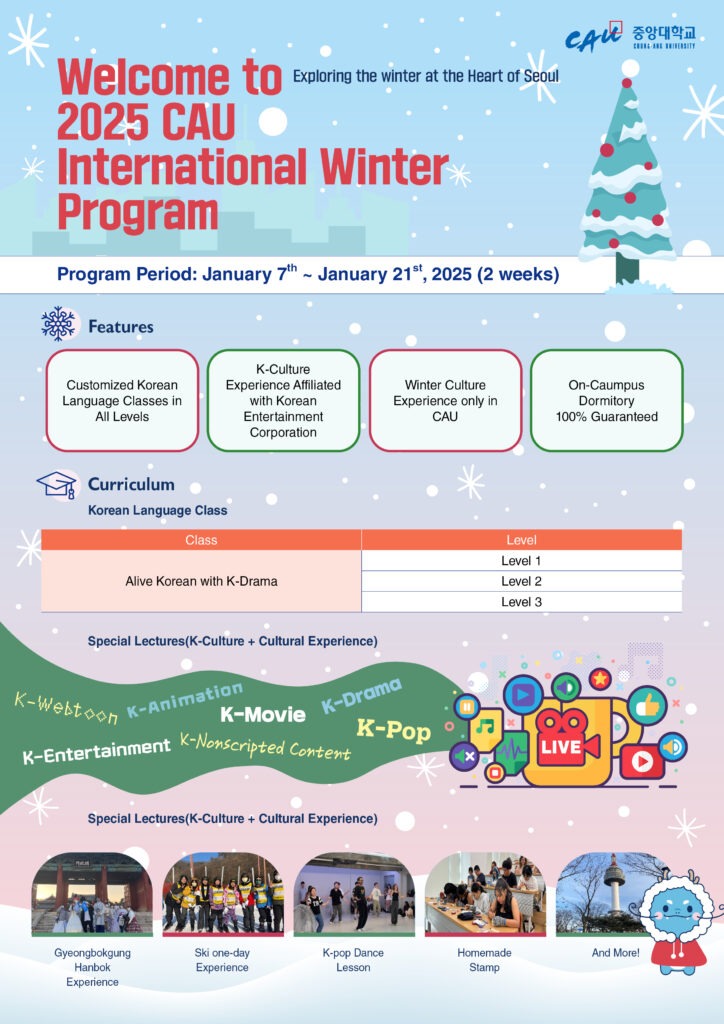 Chung-Ang University, South Korea has opened the registration for the International Winter Program 2025. The accepted students will be responsible of program’s fee, roundtrip ticket, health insurance (if required), and their living cost during the program.