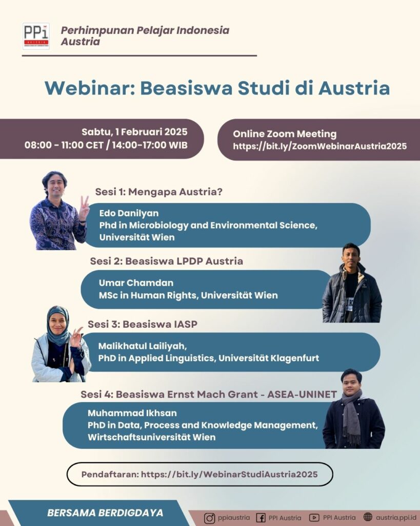 We would like to share you an information about the upcoming webinar from Perhimpunan Pemuda Indonesia Austria (PPI Austria) about Austria Scholarship. The webinar is open for all students who wants to study abroad at Austria. The event will be held at :