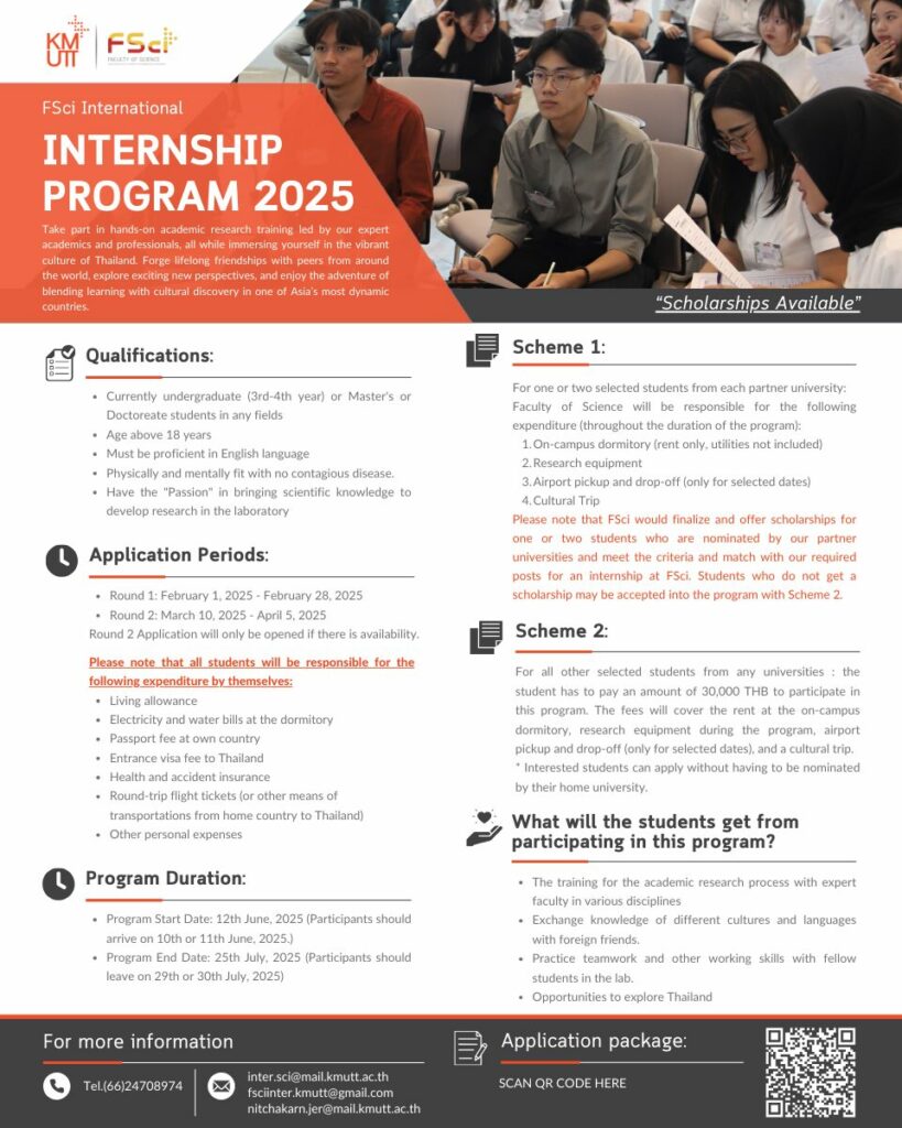 Faculty of Science (FSci) – King Mongkut’s University of Technology Thonburi (KMUTT), Thailand, is offering an opportunity for ITS students to join the FSci International Internship Program 2025 for two months from June 12 to July 25, 2025. The arrival of the selected students should be on June 10 or 11, 2025, and the departure should be between July 29 or 30, 2025.