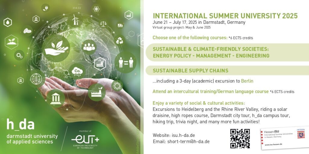 We’re excited to announce an incredible opportunity for you to participate in the International Summer University (ISU) 2025 at Hochschule Darmstadt University of Applied Sciences in Germany! This program offers a unique chance to gain international experience, explore sustainability topics, and immerse yourself in German culture.