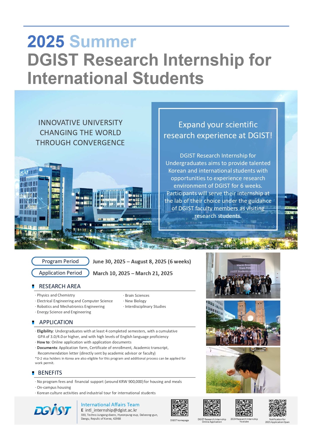 The DGIST Research Internship for Undergraduates offers a six-week interdisciplinary research experience at DGIST’s graduate school in South Korea. This program provides an opportunity for students to engage in hands-on research and explore various topics under the guidance of DGIST faculty.
