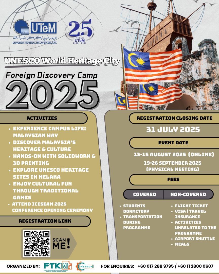 We are pleased to share that Universiti Teknikal Malaysia Melaka (UTeM) is inviting students from its partner universities including Institut Teknologi Sepuluh Nopember (ITS) to participate in the Foreign Discovery Camp 2025.