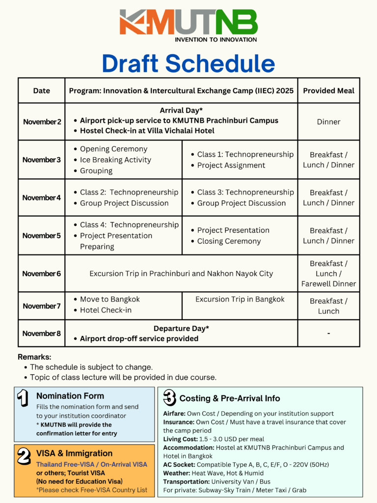 ITS Global Engagement is pleased to invite ITS students to apply for the 2025 Innovation & Intercultural Exchange Camp (IIEC), hosted by King Mongkut’s University of Technology North Bangkok (KMUTNB), Thailand, from 2 – 8 November 2025 in Prachinburi and Bangkok City.