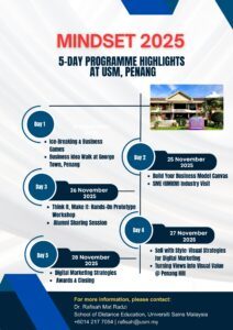MINDSET 2025 is a five-day international mobility programme hosted by the School of Distance Education, Universiti Sains Malaysia. It offers students practical exposure to innovation, digital business strategies, and entrepreneurship through interactive workshops, industry visits, and cultural experiences.