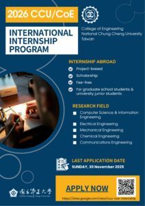 CCU Taiwan is now accepting applications for the College of Engineering International Internship Program 2026. This program offers
