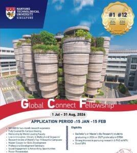 We are pleased to share an exciting opportunity to join the NTU Singapore Global Connect Fellowship (GCF) – Summer Intake 2026, taking place from 1 July – 31 August 2026. This two-month research fellowship is hosted by Nanyang Technological University (NTU) Singapore, one of the world’s leading research-intensive public universities.