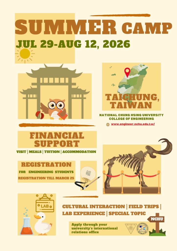 National Chung Hsing University (NCHU), Taiwan, through its College of Engineering, invites partner universities to nominate one (1) student to participate in the Summer Camp 2026, which will be held in Taichung, Taiwan, from July 29 – August 12, 2026.