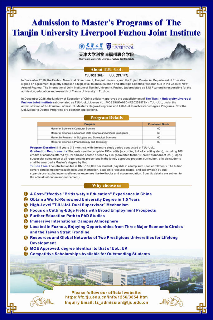 Tianjin University Fuzhou International Campus has officially opened applications for the TJU-UoL Master’s Program.