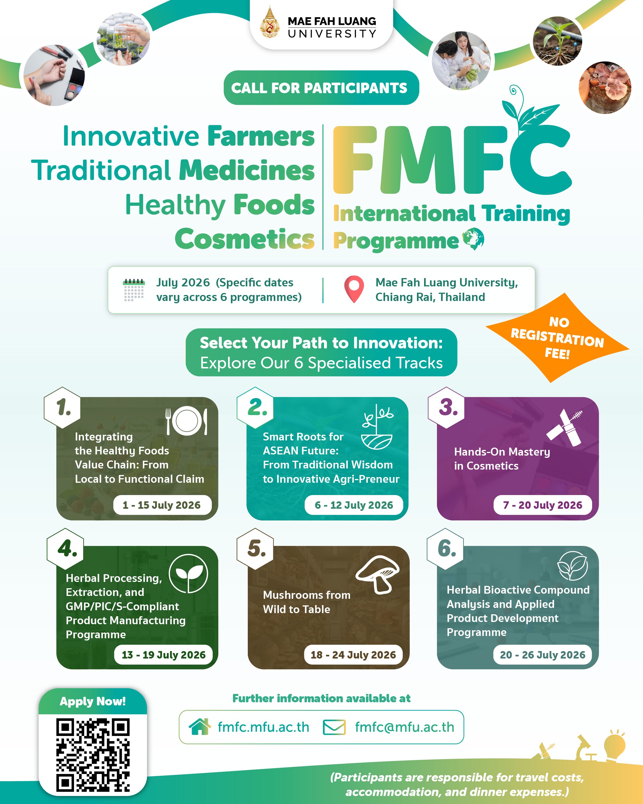 Mae Fah Luang University (MFU), Thailand, invites international participants to join the FMFC International Training Program 2026, a specialised training series designed to foster innovation and capacity building in the strategic sectors of: