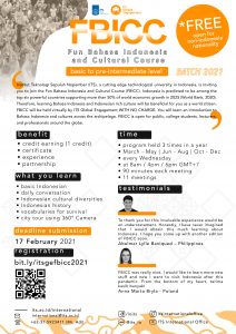 Fun Bahasa Indonesia and Cultural Course (FBICC) is one of Institut Teknologi 10 Nopember (ITS) Global Engagement’s programs which gives an opportunity for global citizens to learn Bahasa Indonesia and cultural understanding. The previous program ran successfully and attended by 198 participants from 25 countries around the globe. Continuing the success, we are delighted to inform you that ITS Global Engagement proudly opens the registration of FBICC 2021.