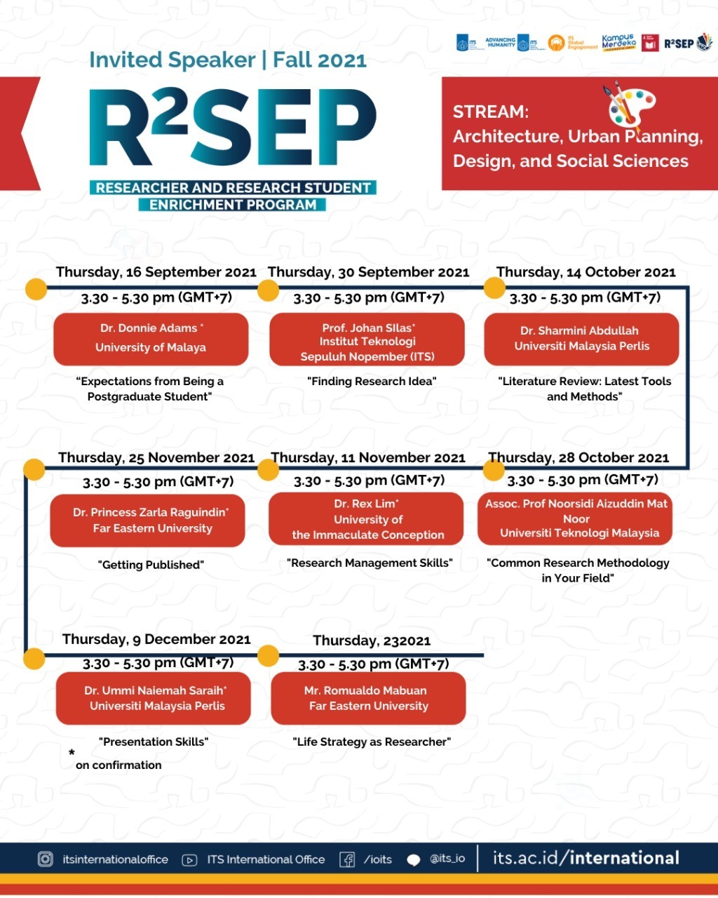 Continuing the success of ITS e-program 2020-2021, ITS is committed to open opportunities for professionals and global researchers to share their expertise through the Researcher and Research Student Enrichment Program (R2SEP) 2022.