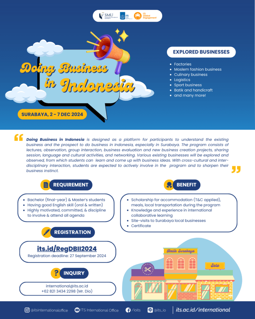 For more information, contact us at: Email: international@its.ac.id (Ms. Reini) Phone: +62 821-3434-2298 (Mr. Dio)