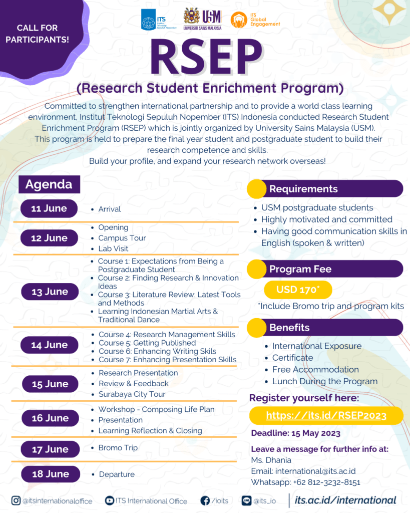 Committed to strengthen international partnership and to provide a world class learning environment. Institut Teknologi Sepuluh Nopember (ITS) Indonesia conducted Research Student Enrichment Program (RSEP) which is jointly organized by University Sains Malaysia (USM). This program is held to prepare the final year student and postgraduate student to build their research competence and skills.